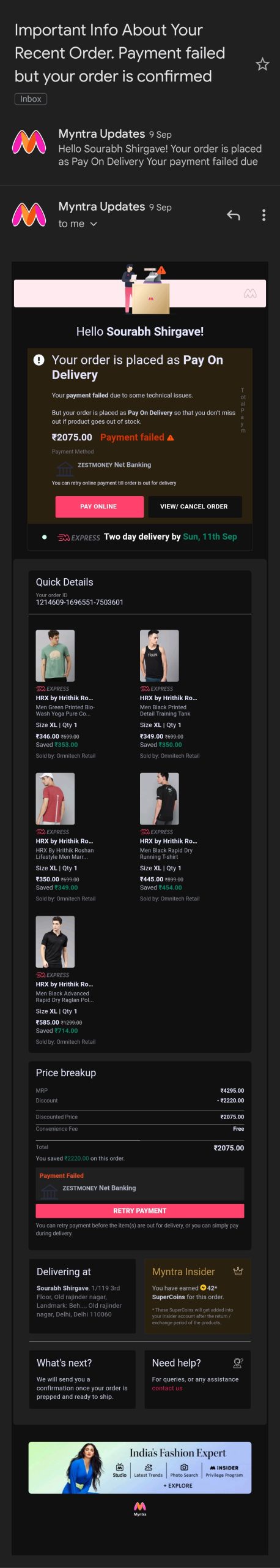 I was ordered items from myntra merchent on 9 sep 2022 of about 5 item of cost 2075 i have 200 myn Cash by Myntra so loan amount was 1875. But there some technical error and order was cancelled and payment failed but from my Zestmoney app money debited and loan approved by Zestmoney. I already paid 2 Emi.