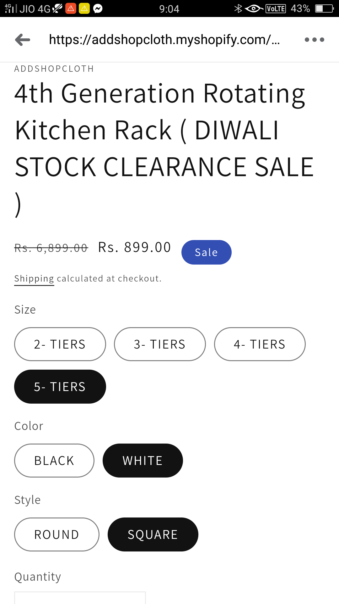 Order summary: 4th Generation Rotating Kitchen Rack (DIWALI STOCK CLEARANCE SALE ) × 1 5- TIERS / WHITE / SQUARE Rs. 899.00