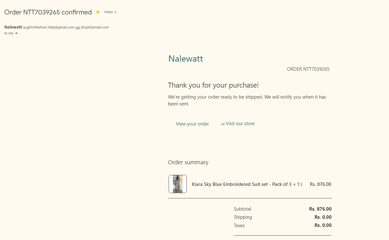I ordered a kiara blue embroidered 3 pieces salwar suit on Nalewatt site (aughtmfashion) by paying 886 rupees. I got a cheap saree delivered. I sent multiple emails to nalewatt.official@gmail.com and aughtmfashions.help@gmail.com but no response. Now Im getting email address is unknown in delivery failed emails. I have their address, so please try to take immediate action on them and get their business shut down so they wont cheat other people.