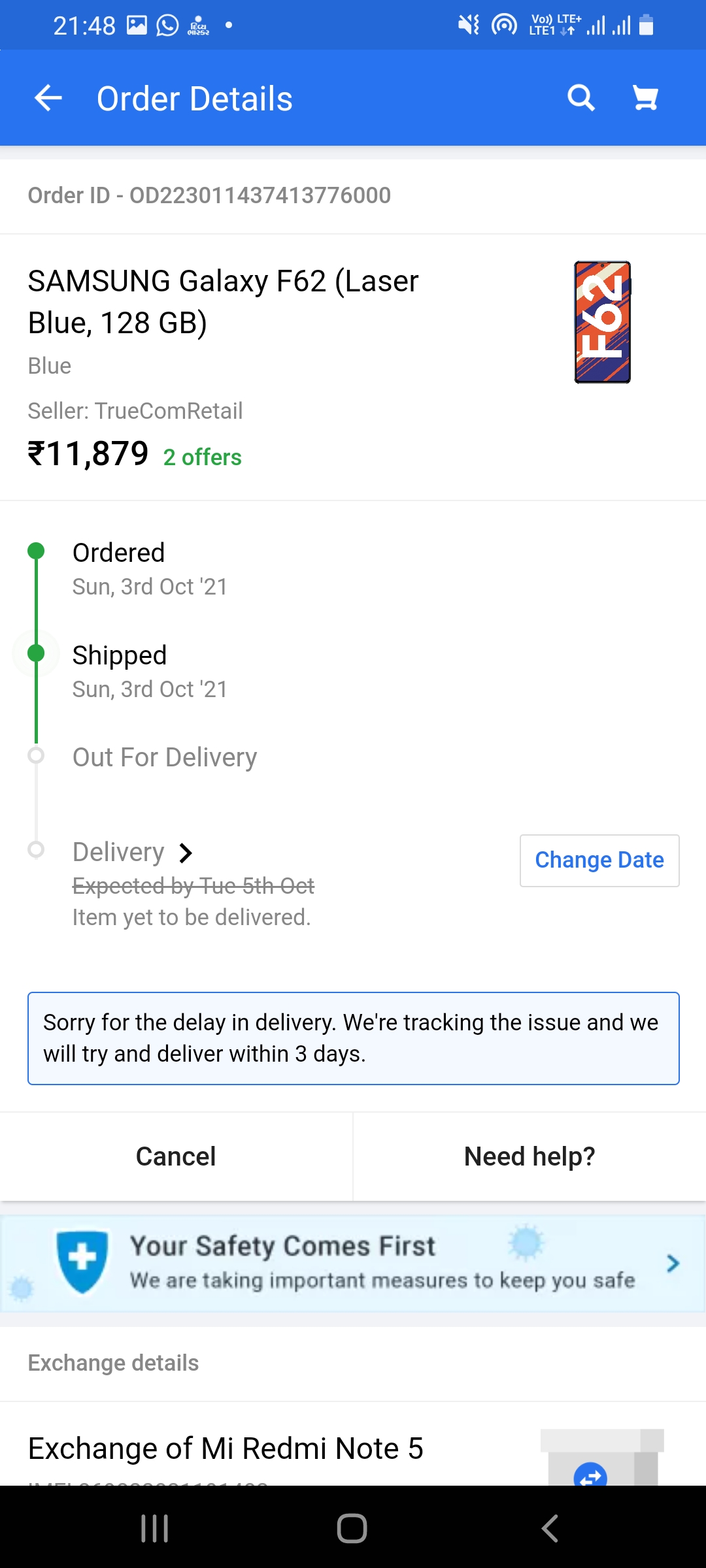 I had ordered a mobile phone Samsung F62 on 3 October 2021 from FlipKart during the sale under exchange scheme. The phone delivery date was first shown to be 5th-8th October. Then it was postponed to 13th October. I had formatted my phone since 4th October. There is no response from the company. When I booked a call on 13th they called me to wait for one day and gave me the assurance to look into the matter. Again I called on 14th and received the same answer. There is no update from the company regarding the status of my order till date. It is a kind of mental harassment from the company. Please do the needful.