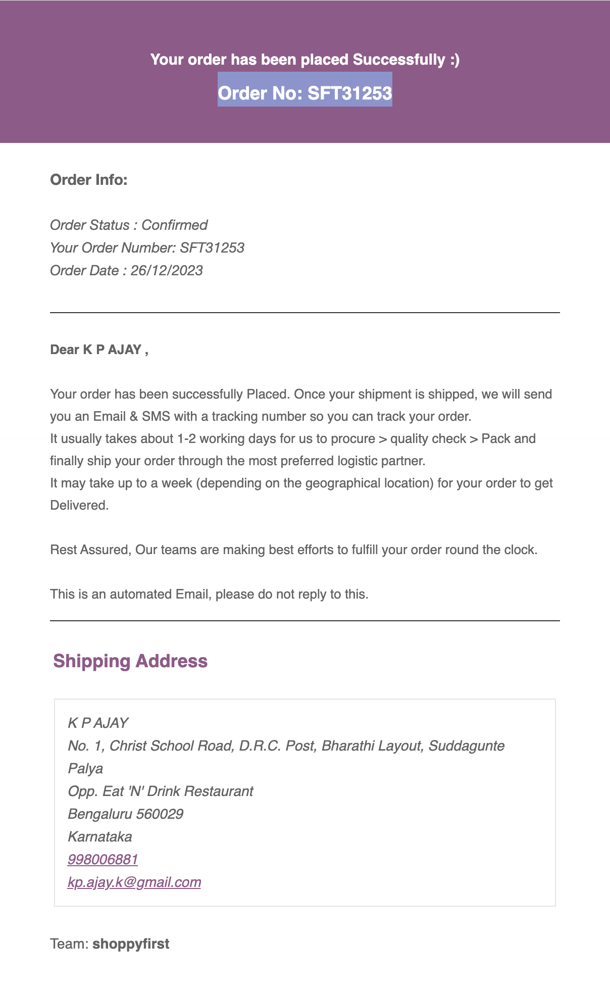 I ordered a tint changing sun smart glasses on an Ecomm site shoppyfirst.com on Dec 26, 2023, at 6:33 PM. They said Your order has been successfully Placed. Once your shipment is shipped, we will send you an Email & SMS with a tracking number so you can track your order. It usually takes about 1-2 working days for us to procure > quality check > Pack and finally ship your order through the most preferred logistic partner. It has been 10 days since I have placed the order I still haven’t got any reply mail from them. They seems to be a fraud company. I am uploading the order conformation mail jpeg.