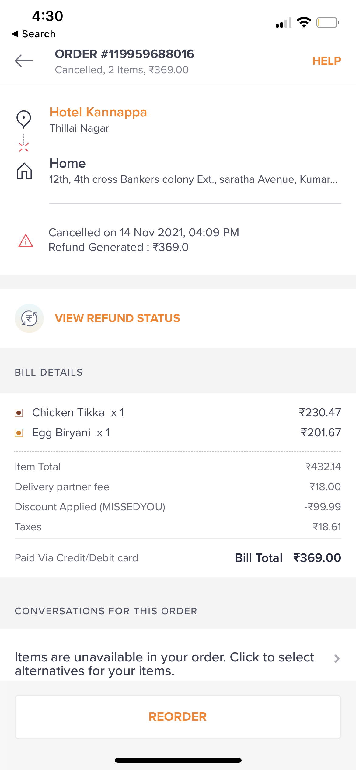 I have ordered Chicken tikka and plain briyani. After the order has been confirmed and delivery person is at the restaurant to pick up, I am getting the call after 20 minutes that the ordered item is out of stock.