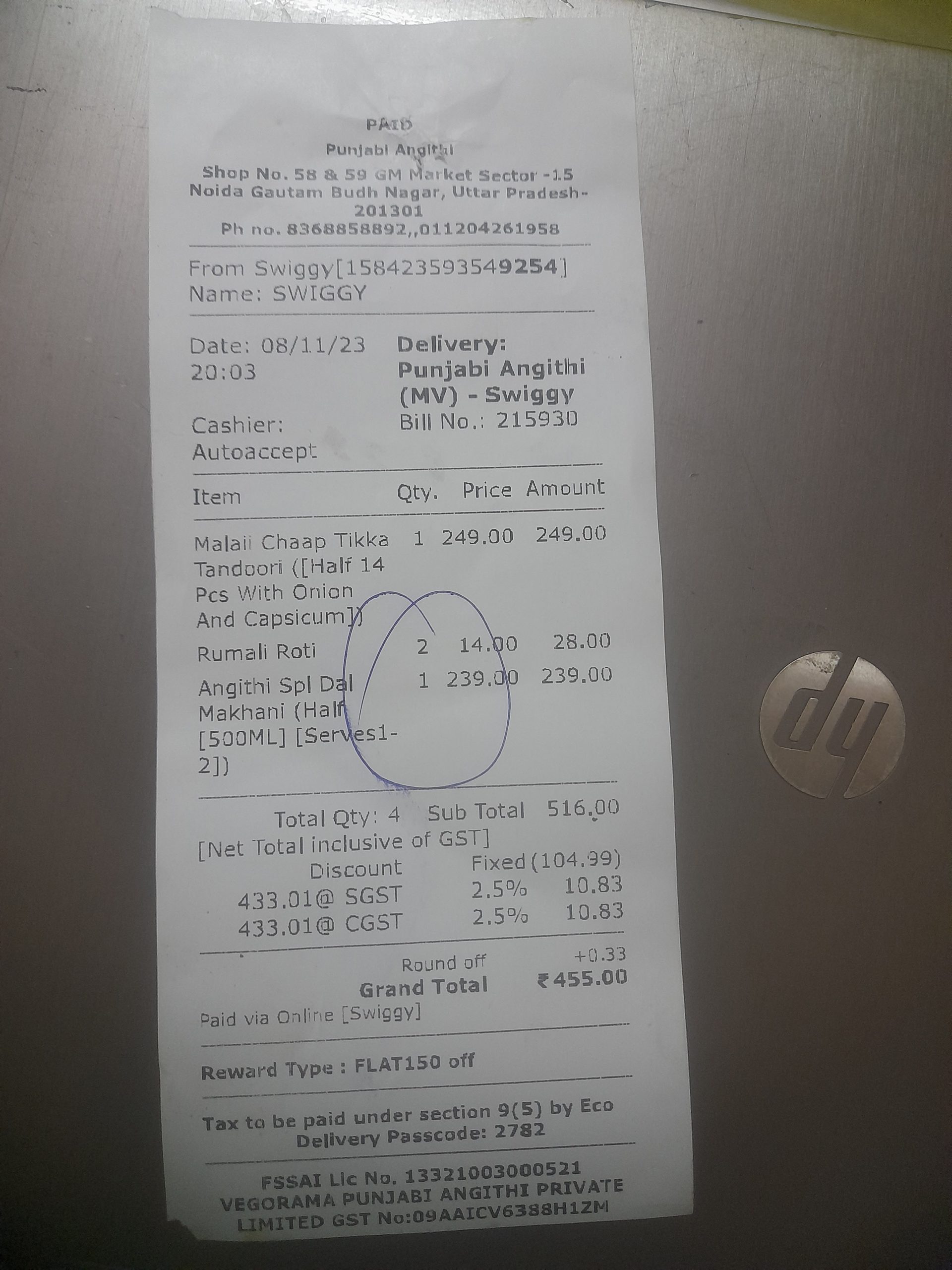 Today u ahd ordered food from Swiggy and they charged me rs 477, however, received bill from restaurant rs 455.
