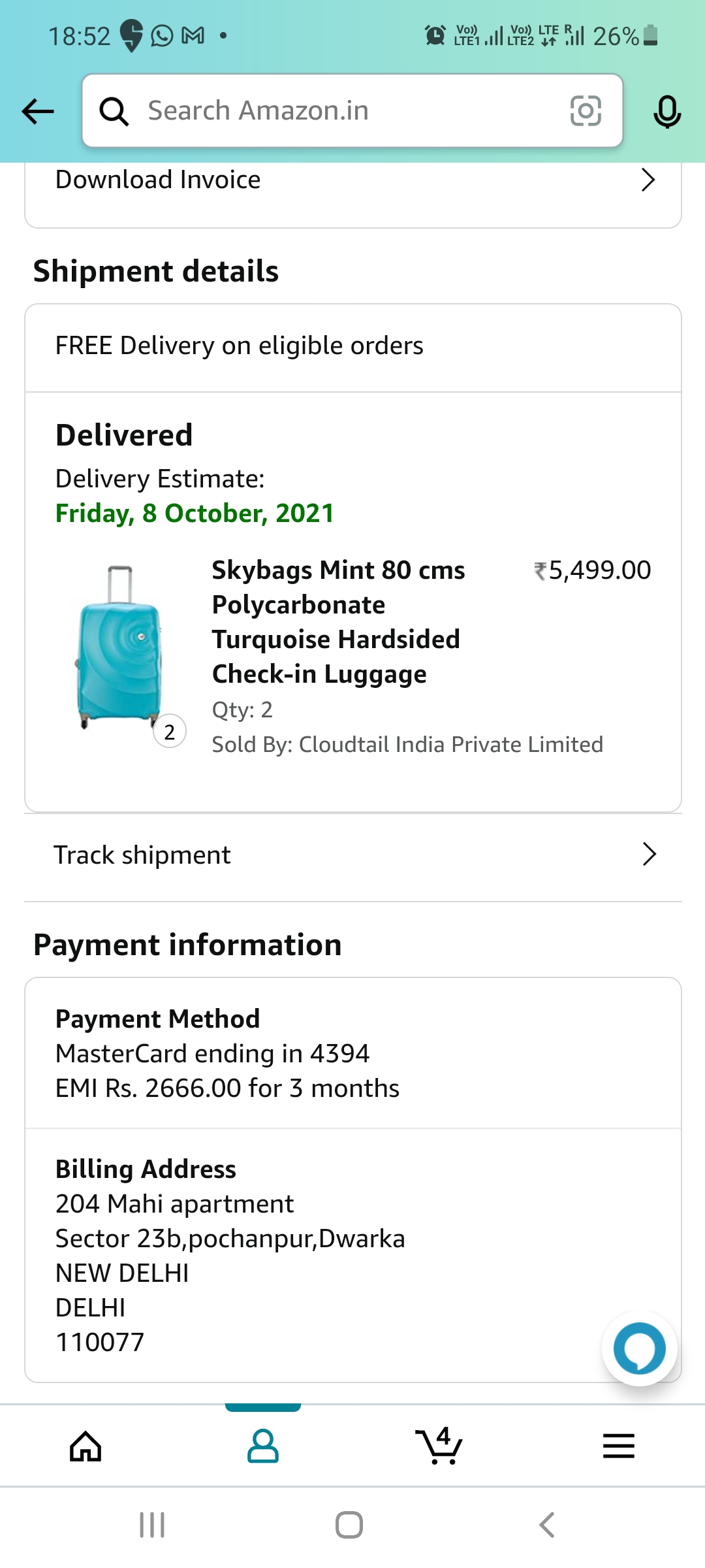 I ordered and paid for two baggages and got just one. The delivery boy Immediately scanned the box and ran away. I also asked the boy where is my another bag, he told me I will get in another delivery.