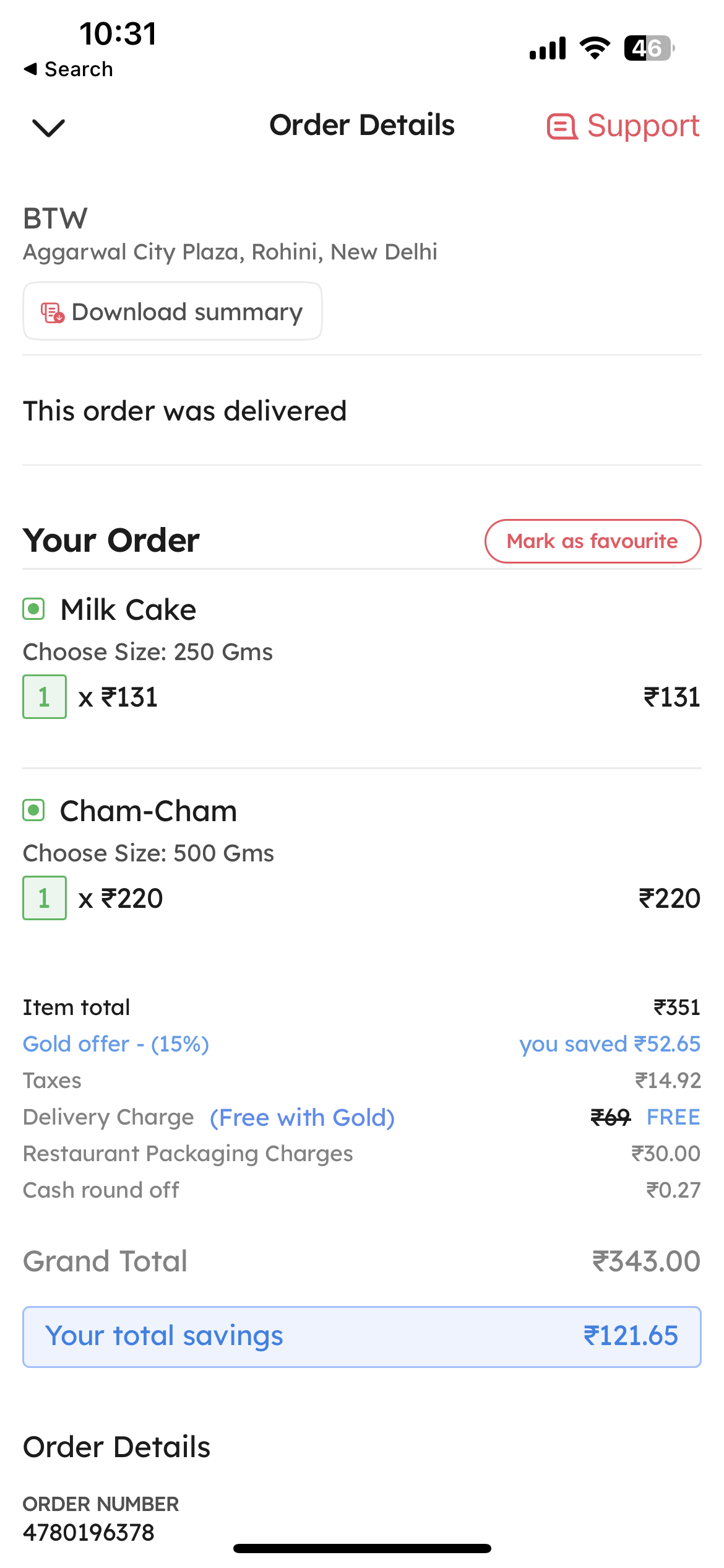 Placed an online order on zomato app for two items from BTW — Milk Cake and Cham cham, from BTW. This ideally should have amounted to Rs 313, including GST. Unfortunately, an additional Rs 30 was levied (plus GST). By the time payment was made, the bill amount came up to Rs 343. The extra Rs 30 was for “packing charges”.