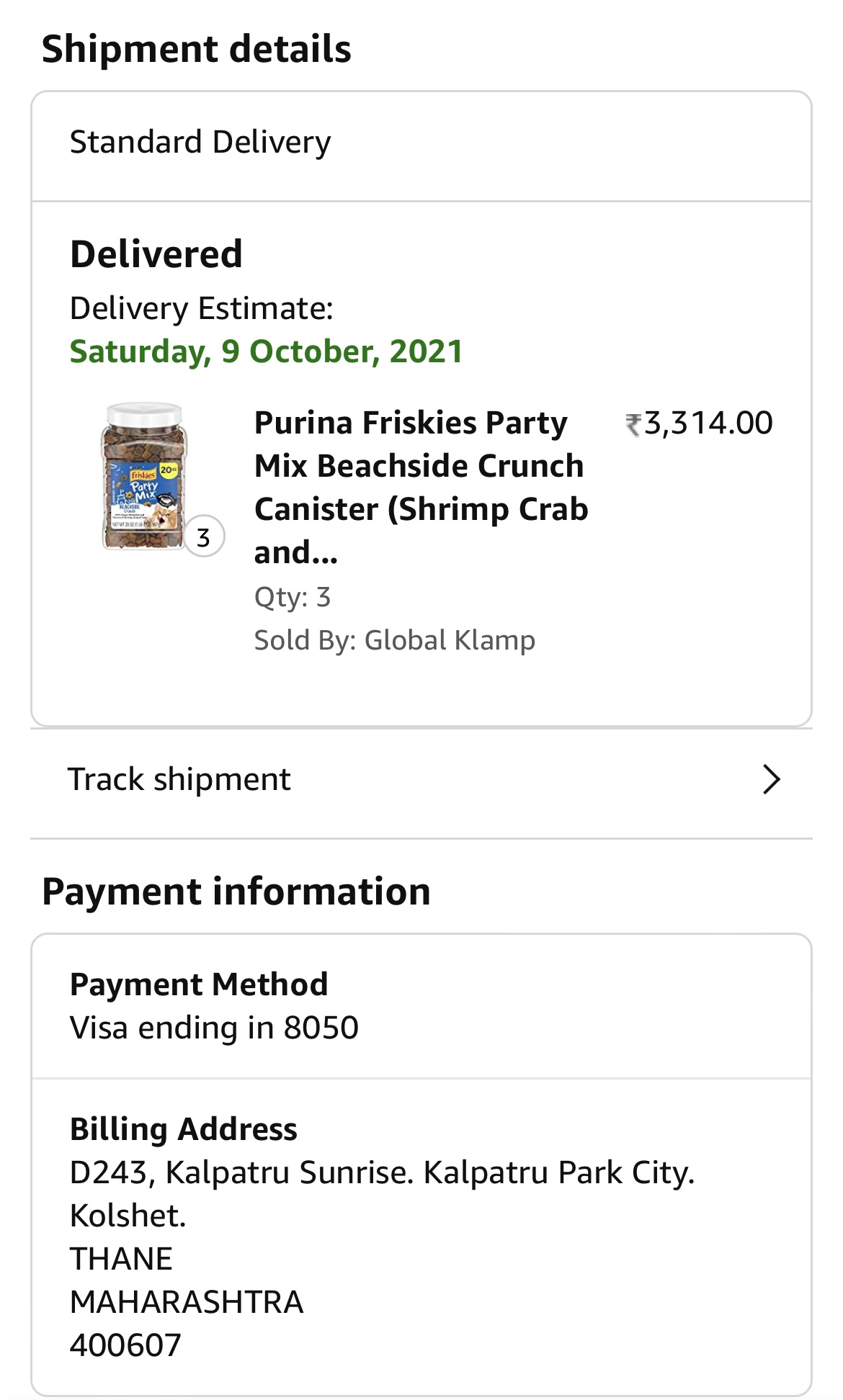 I ordered 3 boxes of Purina Friskies Party Mix. I received only 1. Twice I got a call from Amazon that only 1 box is going to be delivered the other two will follow later. I’ve written to Amazon they tell me that my email ID is not valid for them to track. I am registered via my phone number. Can you please help me in finding out when I am going to receive the other 2 boxes of cat purina friskies treats. Payment is made for 3 boxes. Thanks