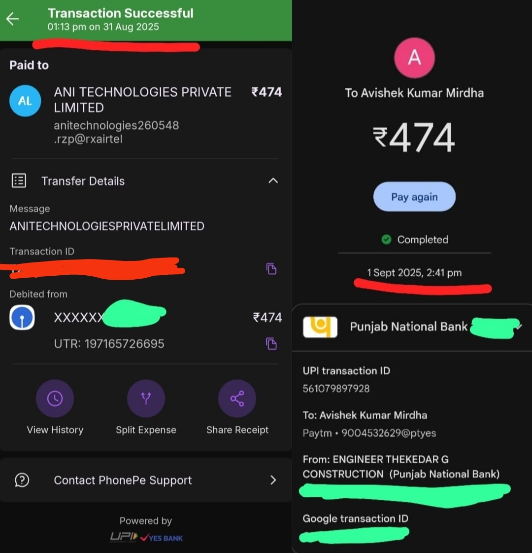 I booked a cab registered on Ani Technologies Private Limited on 31st August 2025 from howrah railway station to abhinandan tower santoshpur. After reaching my destination I payed 474 to Ani technologies pvt Ltd . Albeit the payment was successful the cab driver said he didn’t receive any money from the said company and continued bugged me for straight 2 days telling that he didn’t receive money and I had to pay the driver again. So, I paid twice. So kindly refund my money because ani technologies pvt Ltd has taken money twice once from customer and again from the driver who drives the companies vehicle. This is how you loose trust and credibility. Please kindly refund my money and instill some professionalism because people are naive and trust at face value and when they loose their trust and feel abandoned, you are the one who suffer customer base and relevance in the market. So it’s my humble request to the company to check into the said matter and redress my grievance.