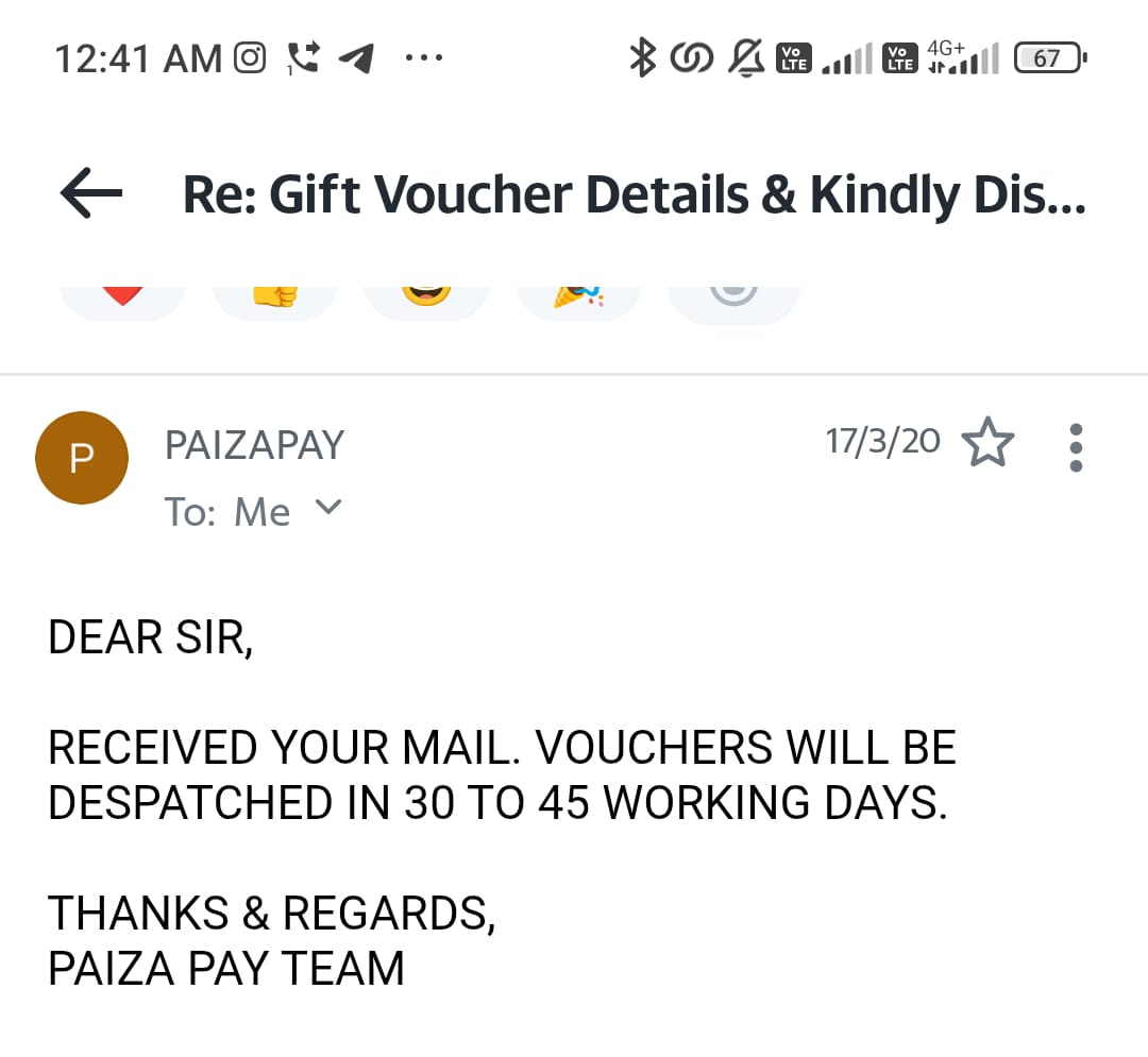 I am paying amount 220000 But he is not give Voucher .after payment conformation he is given email but voucher is not recived . Email is also attached. My sister marrage is done but she is no more & tottly responsbilty Paizapay becouse she is not avlebule in Dahej utpidan .