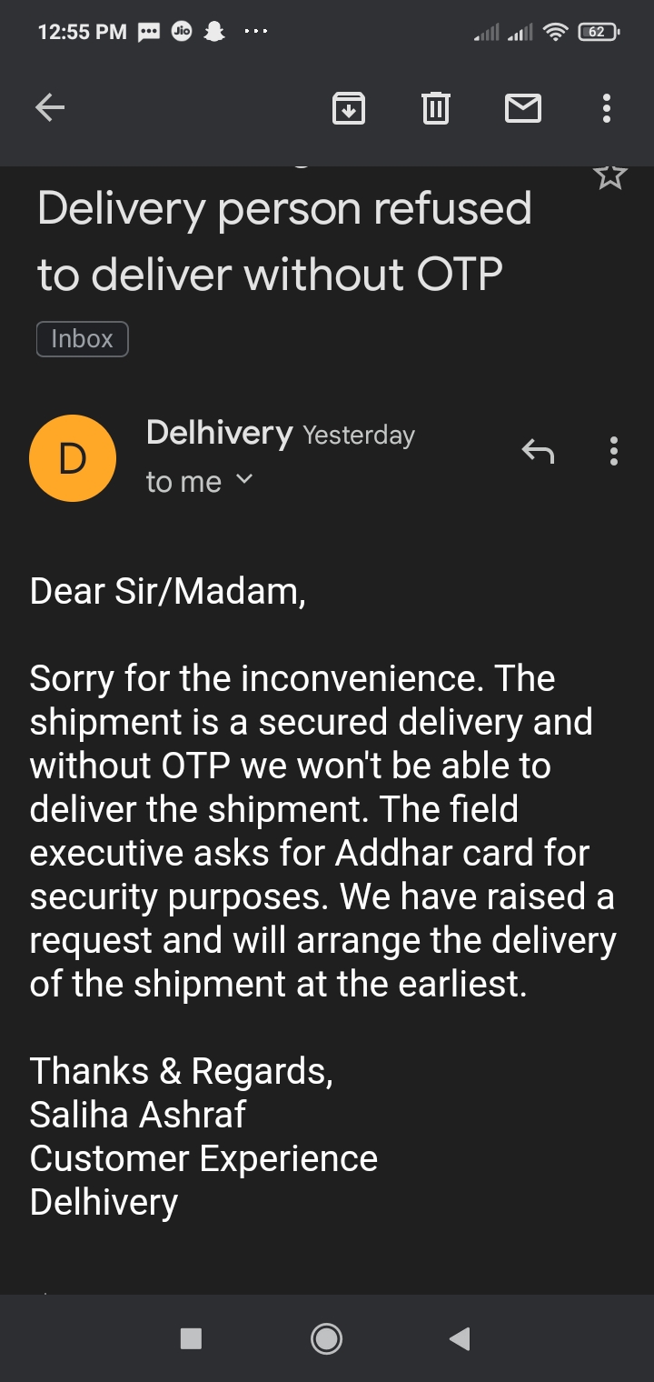 I purchased a suit from Meesho on 16 March Meesho by paying them 669/- online. It was a paid order. On 20th March this suit was delivered to me. But due to size issue I raised an exchage request. Accordingly, the exchange request was accepted and the suit was picked up for replacement on 21 March. On 25 March a delivery agent from Delhivery came to deliver replacement of my suit. He asked me to provide an OTP but I didn’t receive any OTP from Delhivery. So, he didn’t not deliver that suit to me.He asked me for my credentials like Adhar card and PAN card. He said that share these credentials on WhatsApp no. I refused to provide such details to him. This is not the first time he was asking such details earlier he did the same and didn’t deliver my product. I made a complaint regarding this whole incident to Meesho. I shared a video also to Meesho while he was asking my credentials. I requested them never deliver any product to me by courier partner Delhivery. However, they again sent my parcel through Delhivery. He did the same. I registered a complaint again to Meesho about this whole incident. I am following up with Meesho daily to get my suit. Now Meesho is saying that they don’t know about courier partner. I lost my my money as well as my suit. I called up to Delhivery also. They sent me emails regarding my complaint. But they have not delivered my suit as yet. They update a status on daily basis that their delivery agent is out for delivery but he doesn’t come to my home to deliver my suit.I am sharing all the screen shots of Meesho and Delhivery.