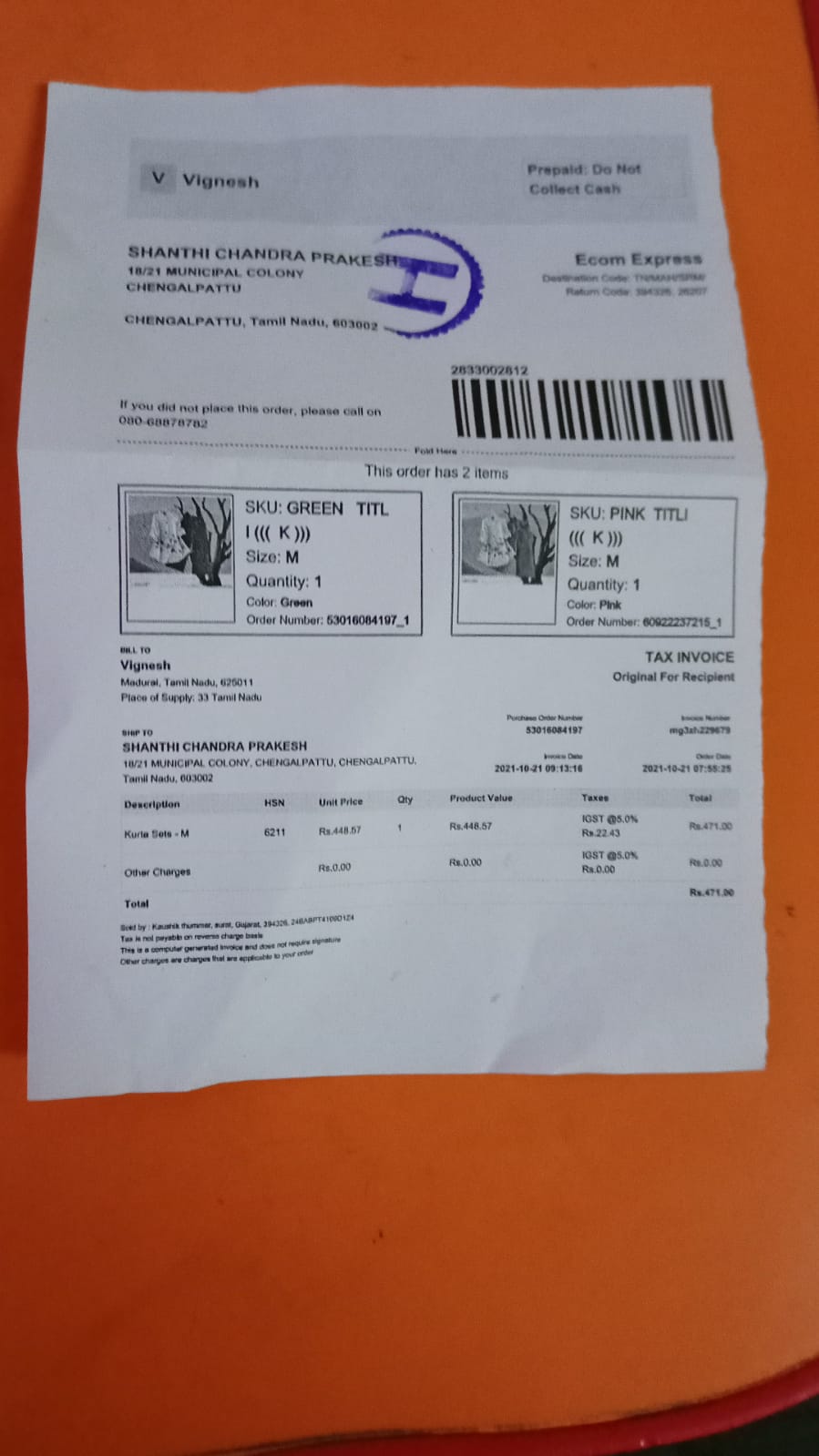 I have 2set of dresses in meesho the parcel is booked through ECOM EXPRESS ON SAME AWB NUMBER but only one dress is delivered another one not delivered