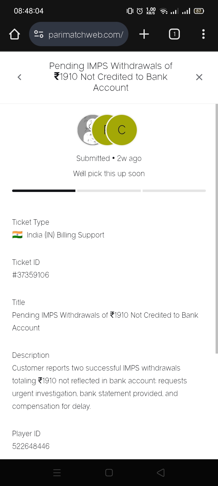 Parimatch violating my fundamental rights. Wasting my time giving false hope, looting my money. Withdrawal success but the money is not received is violation of fair play.