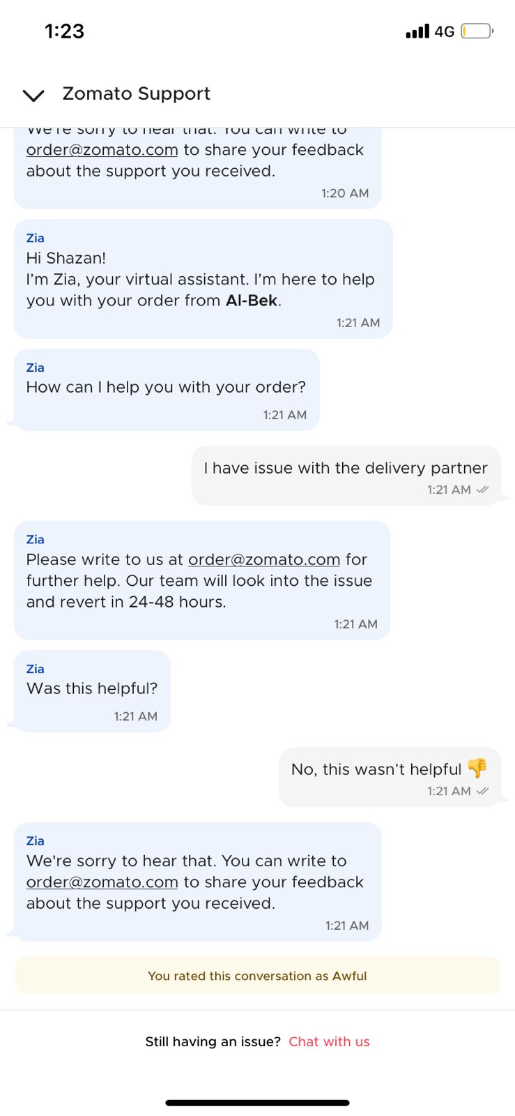 This is to bring to your notice the worst and most pathetic service provided by Zomato and their drunk executive I have ordered food from Al bek RT Nagar and the delivery partner of Zomato was drunk and telling me I don’t have your order and disconnected the call by 1:30 was 1 hour of placing the order the only reason I placed an order from Al bek is that it is 5-10 mins from my house and I wanted food asap as I was hungry the only reason we use food delivery online as its hasslefree we don’t have to go out to eat at that time or any time and stand in queue and get the food get back home and eat we pay service charges and delivery charges on a higher level at midnight. This needs to be escalated coz I think this is my2 or 3 bad experience like this needs to be taken seriously I was so irritated that I had to go to the hotel and tried to pick up the order from the restaurant guy was too sweet but couldn’t help us and you support this is just waste as your delivery executive and they are asking to wait for 24-48 hrs at the time you need to resolve issues like this on spot coz its a matter of Food have attached this SS for your reference.