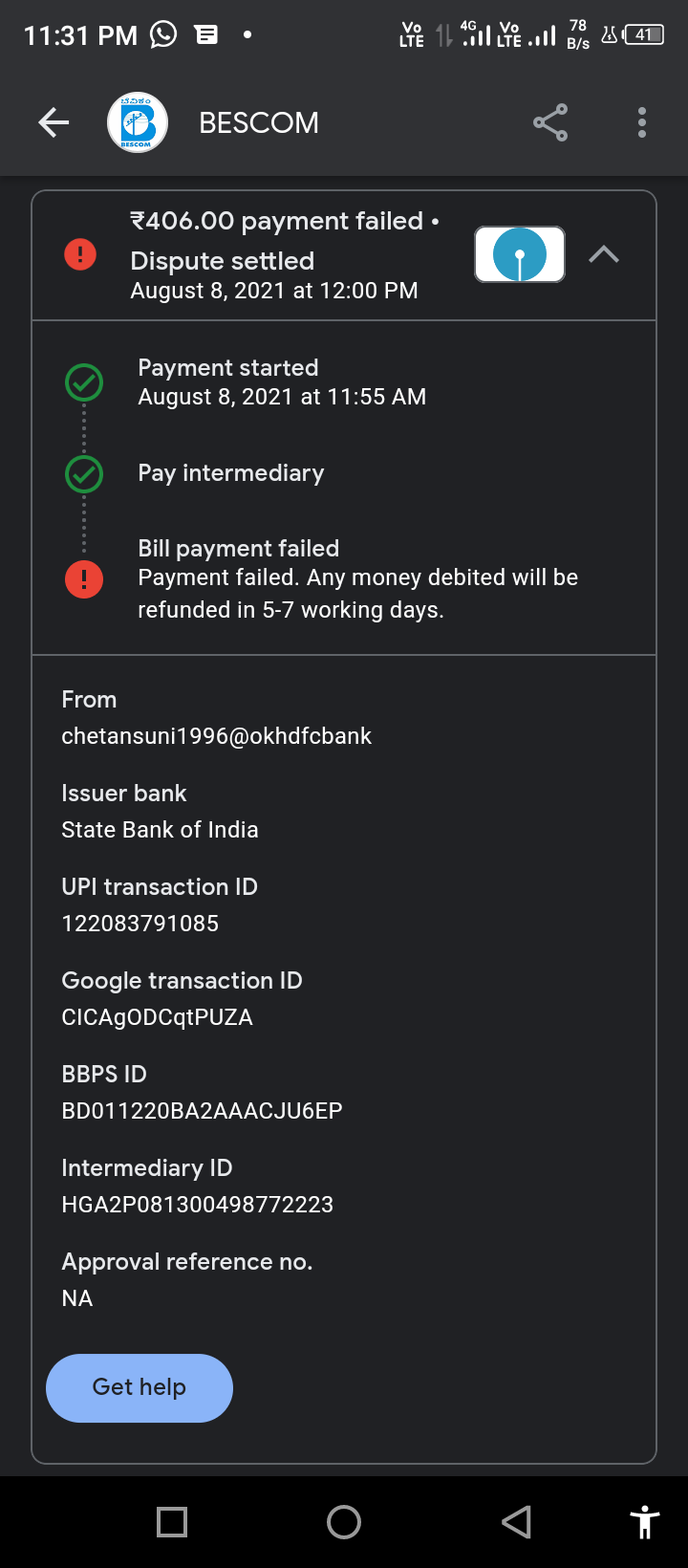 I have paid electric City bill through Google pay on August 08, 2021 for 406/- rs and the transaction was updated as failed but the amount was debited from my account later on i have contacted Google pay multiple times but not getting any proper response so please do help me on this issue.