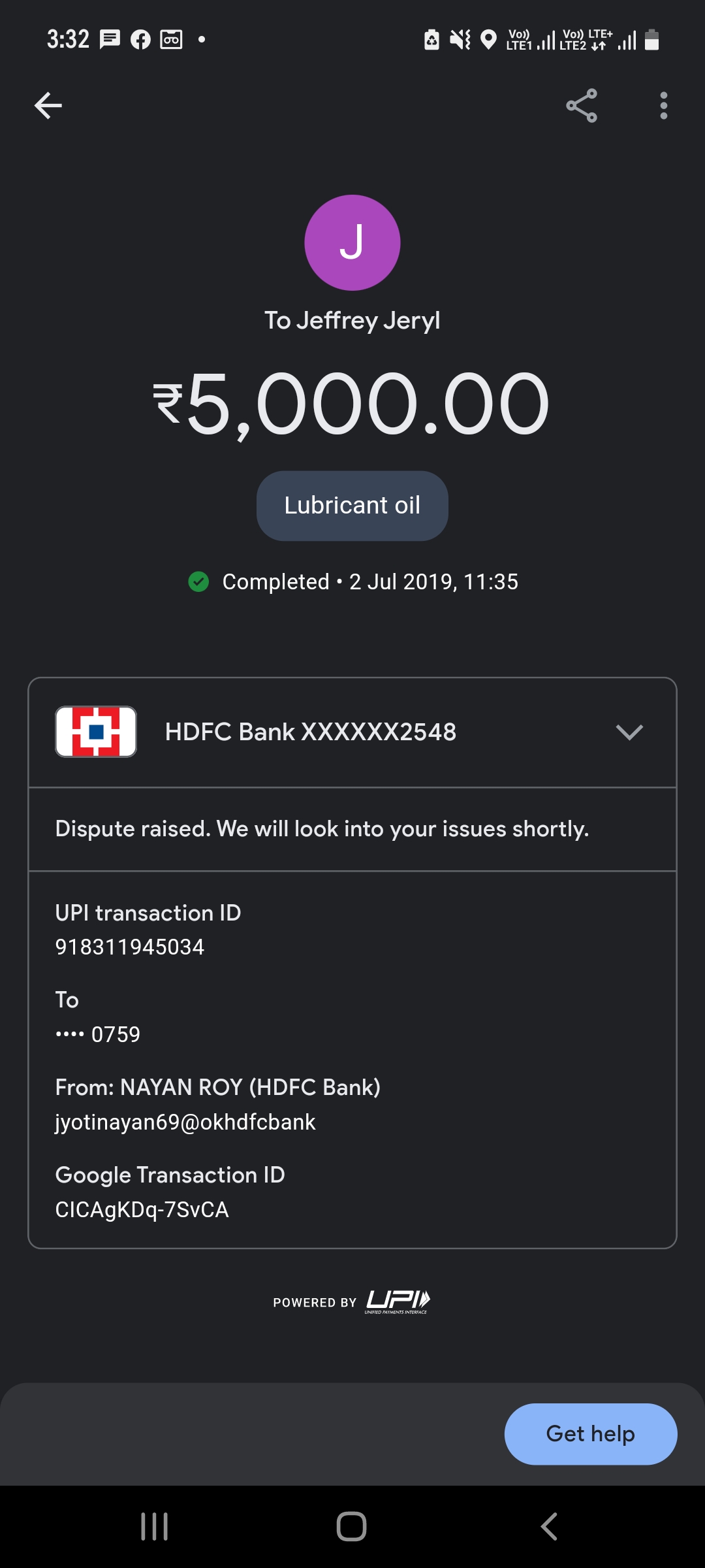 I have made an transaction through Google pay from my HDFC saving account a sum of Rs 5000 to Punjab & Sind Bank on 2nd July 2019 at 11:35..