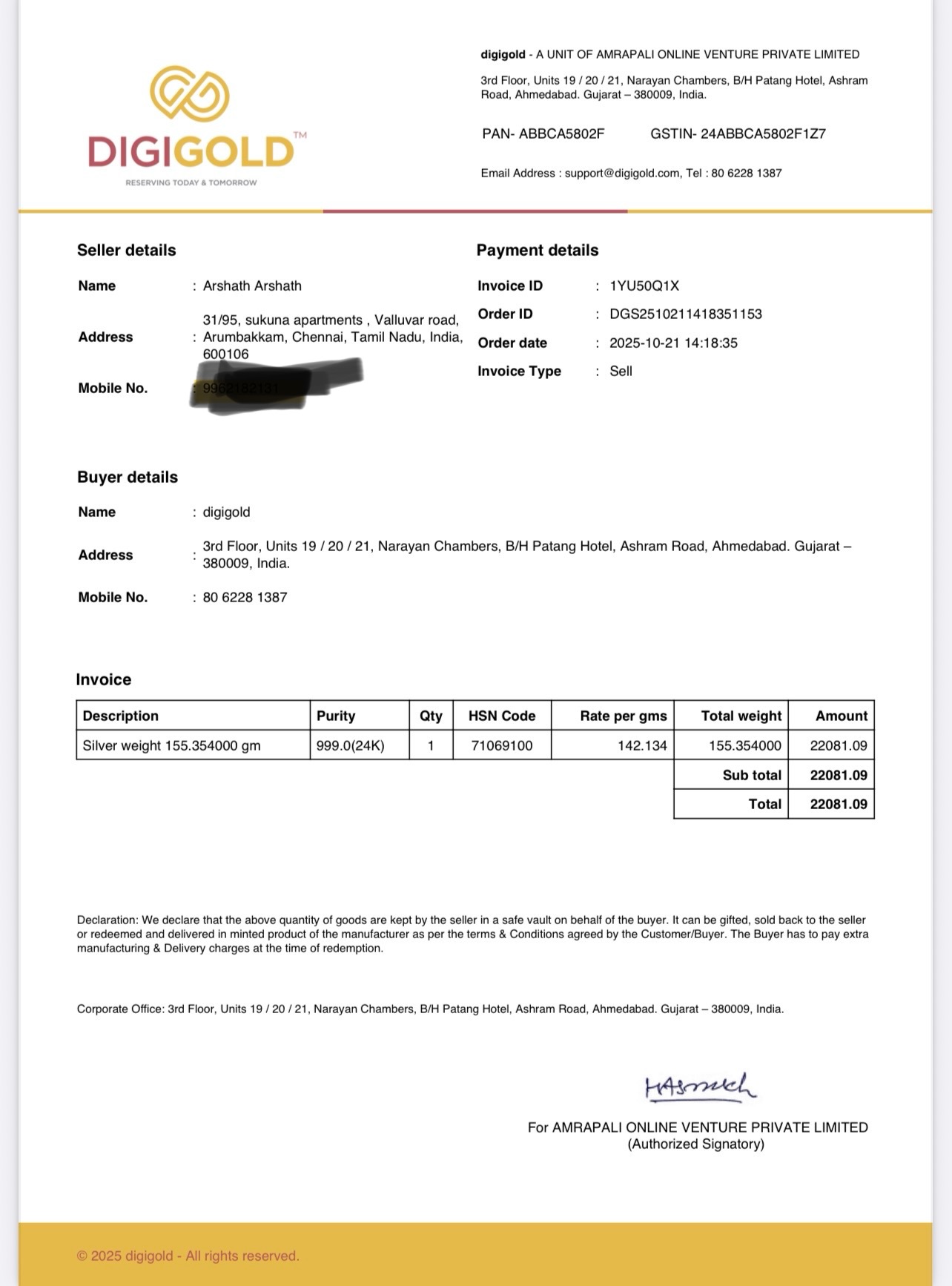I had sold silver 155 grams worth 22081 on october21st 2025. And they have payment waiting period of 7day for the amount to get credited. Bit then today they’ve cancelled the order without informing me or notifying at al. This company has a history for doing tge same to many customers and i am stuck with them now. I have 2 more gold sell order pending worth 36000 and it’s still