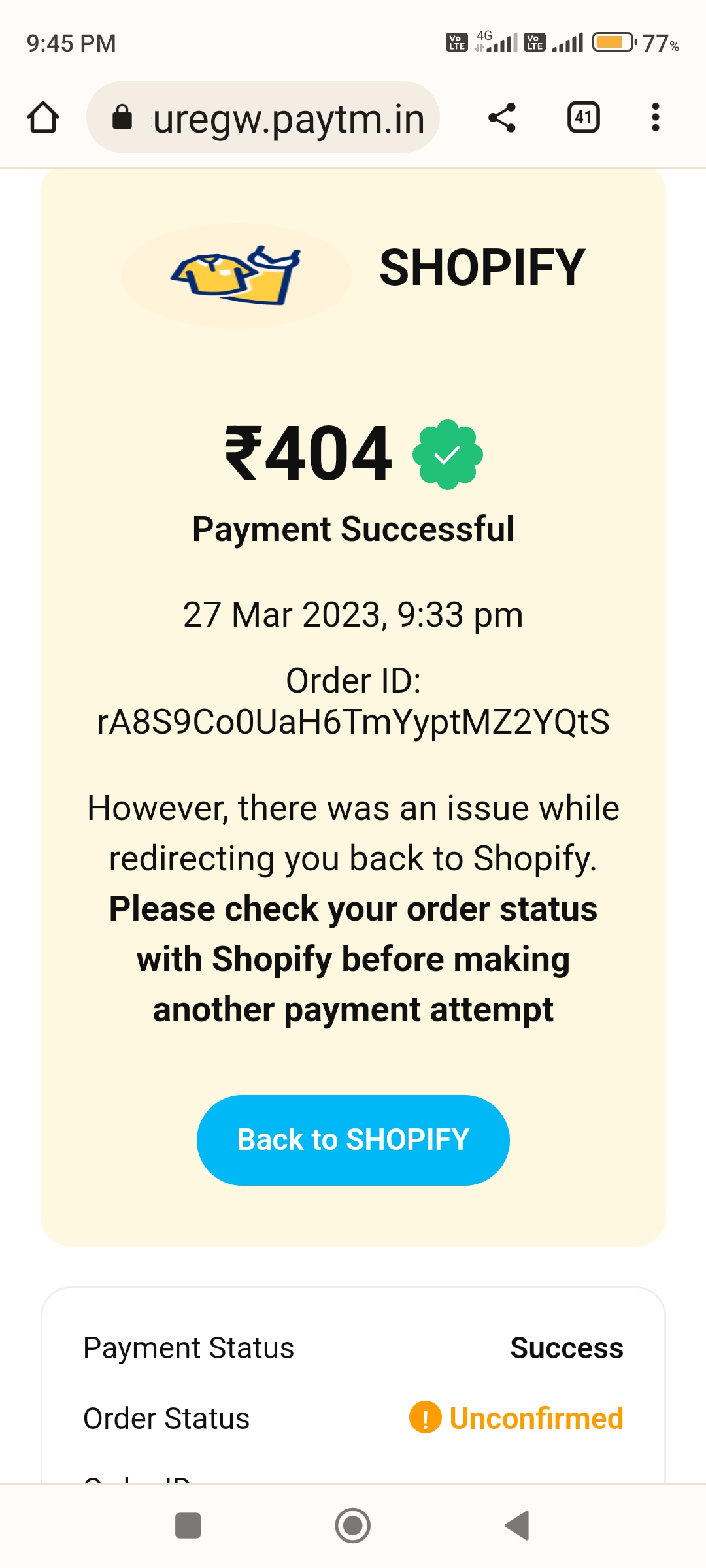 Today I have purchased brass chain of Rs 404 from design cart.com paid through Paytm postpaid. Payment was successful from Paytm but pending (unsuccessful) from seller & also not getting confirmation of my payment from seller.
