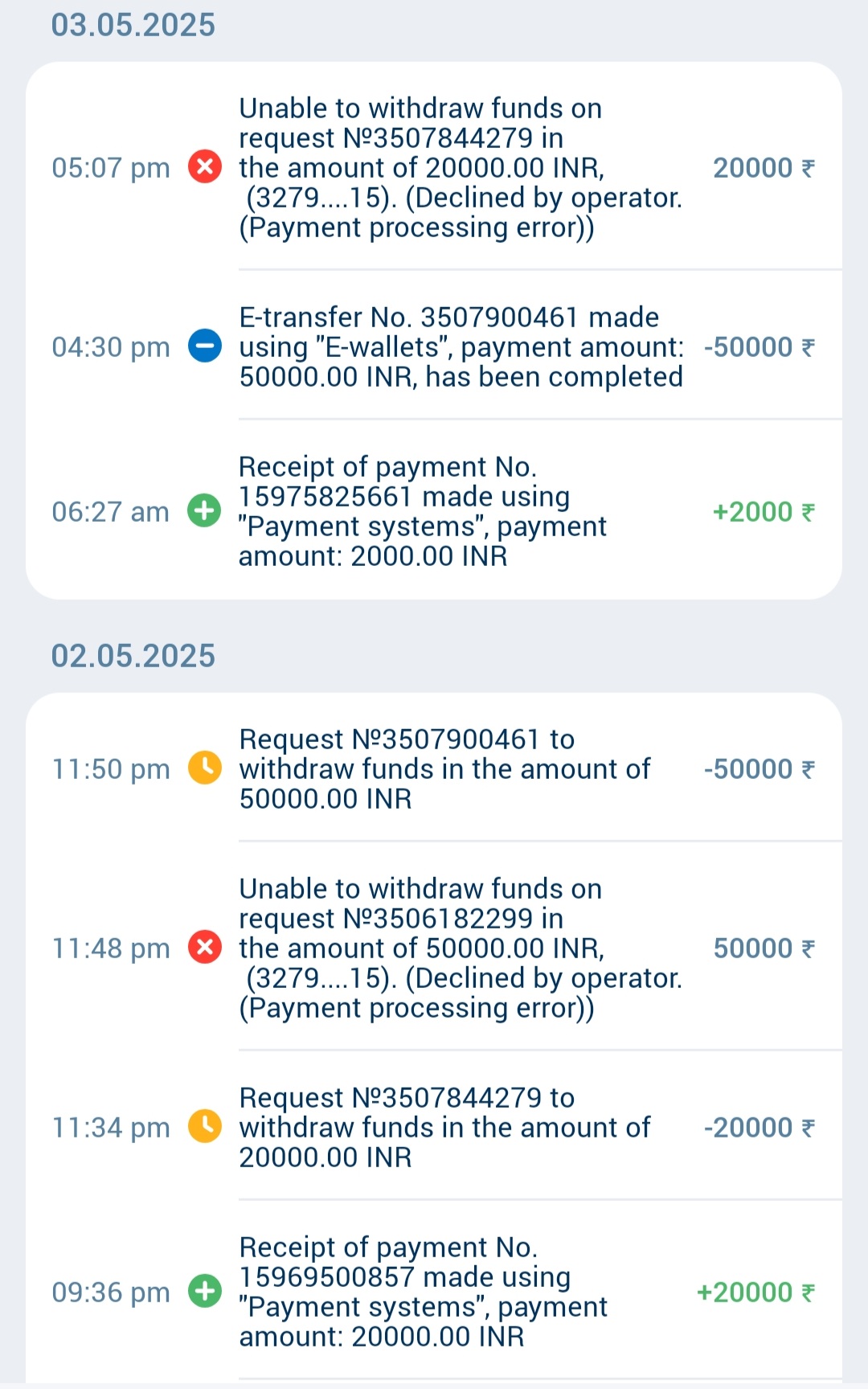 Hi, I raised a withdrawal request of 50000 on 02/05/2025 TIME 11.50 PM.Next Days received a notification in 1xbet that withdrawal is successful.However, date 03/05/2025 time 04.30pm I checked in bank statement-there is no such transactions till date.I raised a query but they shared me a wrong NEFT UTR details to check with bank.I checked with my bank,but they mentioned that NEFT UTR no. shared by me is not correct.It should contain alphanumeric characters.They also checked in entire transaction for 03,04,05,06,07,08,09,10 may.No such transactions received in entire bank.I shared 20 times my bank statement pdf send 1xbet mail everything on email but they keep ignoring my issue,Now a days they are doing these things with many people.They don’t have any structure,rules.They self create rules,without following RBI and Govt of India protocols.