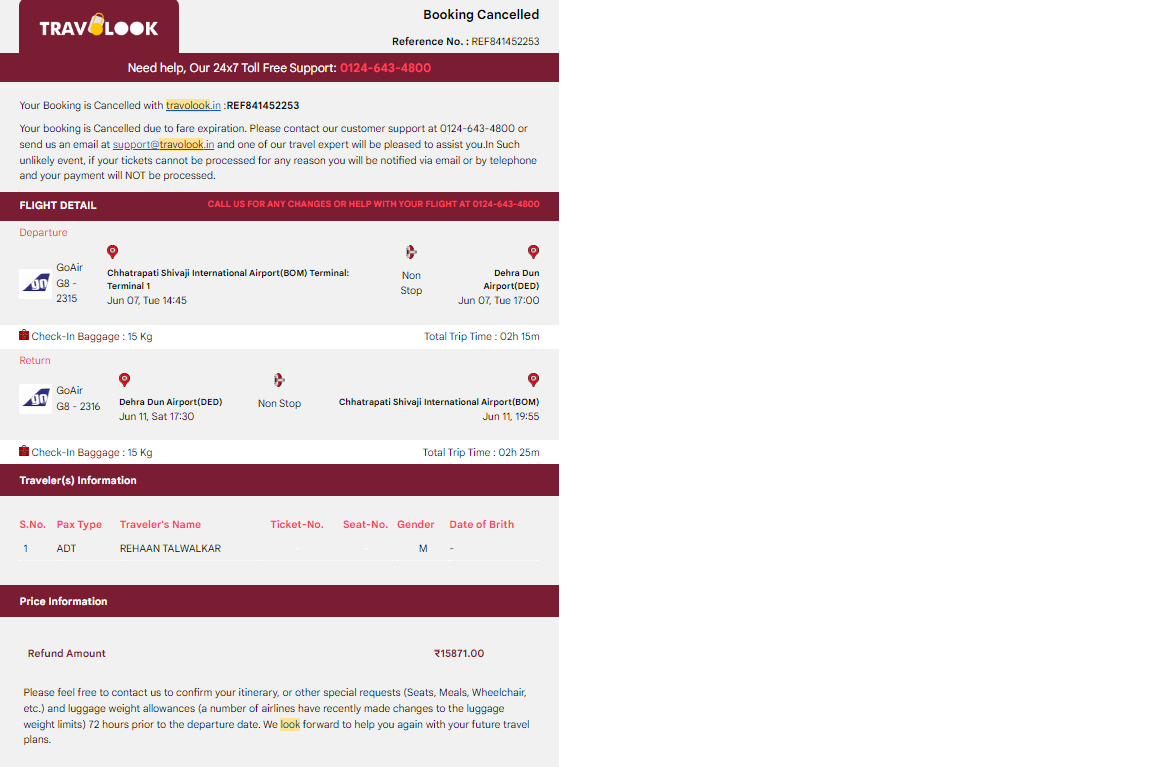Hello, I had booked a round trip from Mumbai to Dehradun on 21st May 2022 – moments after which I was called and told that my flights are cancelled because the fares changed.