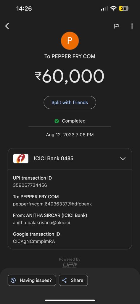 Also i understood from the customer care that Mr Gautam raised the invoice but not in my name, there is no record of my order in Pepperfry system. So basically it looks like a case of cheating or fraud. I am attaching the invoice and the Gpay transaction for the same.
