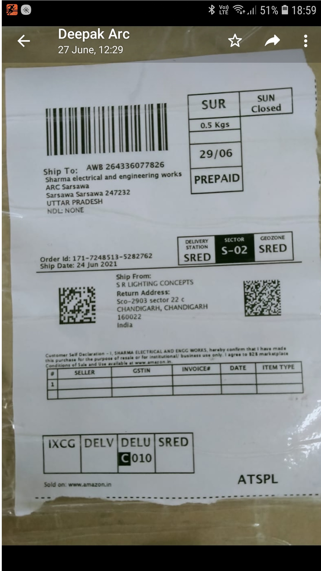 I give order Amazone New SR Light Order# 171-7248513-5282762 date 22 june 2021 for 30 light philips non rechargeable comet wall light 30575 white but received single packet weight 0.5 kg date 27/06/2021 when packet open only 1 light Different make in packet out of 30 light