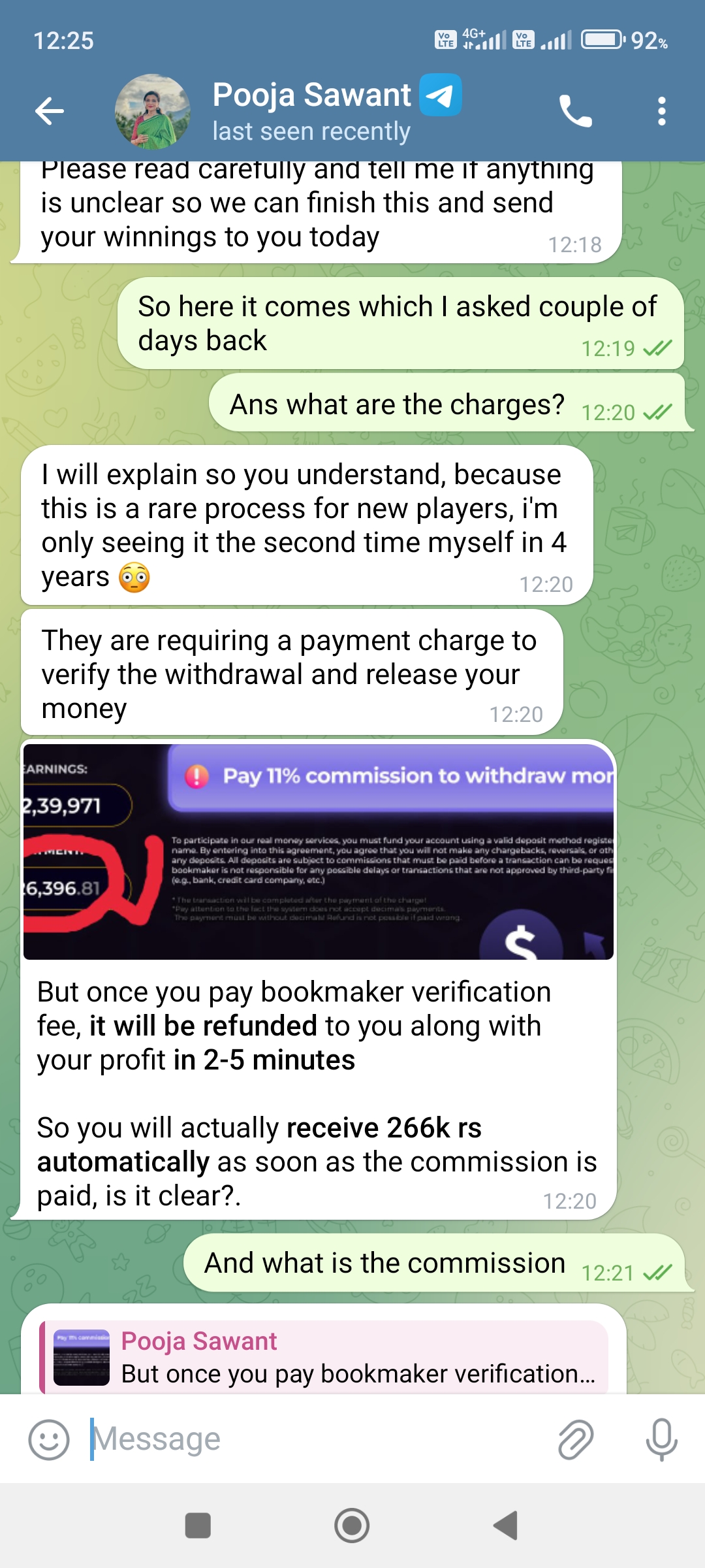 So from many days I m seeing ads from so called pooja sawant who calims to give profits in minimum investment of 7000 and on my very bad day I trusted by seeing many reviews on her telegram channel she asked to invest 7000 and said she will be doing this from many years so I can trust her I invested 7000 after borrowing from someone after 3 hr she shard the screen shot for 239000 profit and asked for my upi id to transfer and here her game starts she showed that something is not gd while transfereing money so asked for identity verficatio charge of 11℅ commission and when I refuge to pay that I can’t pay she stopped responding to my msgs. So people pls don’t fall in this trap ahe is running ads all over social media who are looking for some online work from home or any type of earning from home.