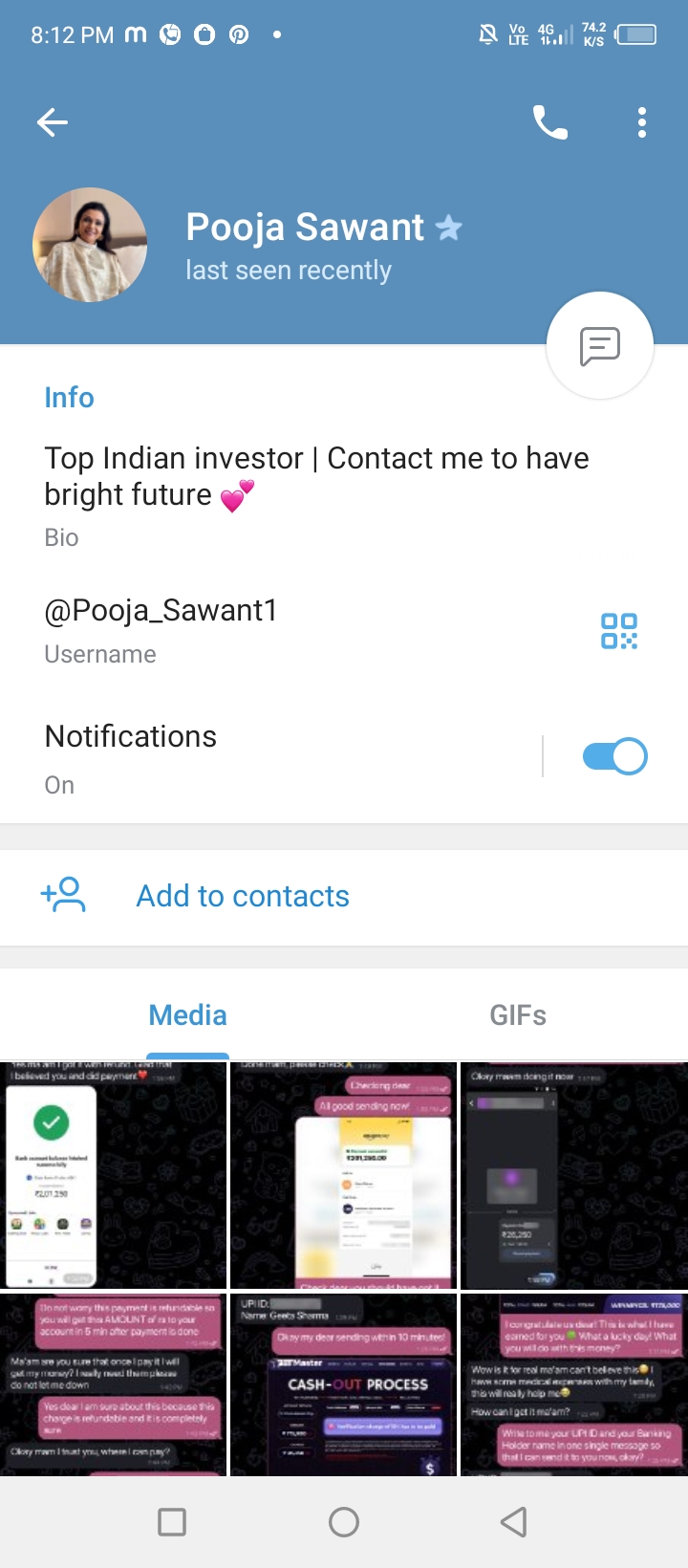 Pooja sawant her name is but she is big fraud she running channel on telegram and asking 7k to invest ,she said she has license to run this investment and after 2 to 3 hours she will return 85k for 100% sure but once u will deposit then she will start drama for cash out process she will ask to 26k again to put to withdraw all money when i denied she started argue and bad language she uses . The upi id she share is jitu.13@superyes