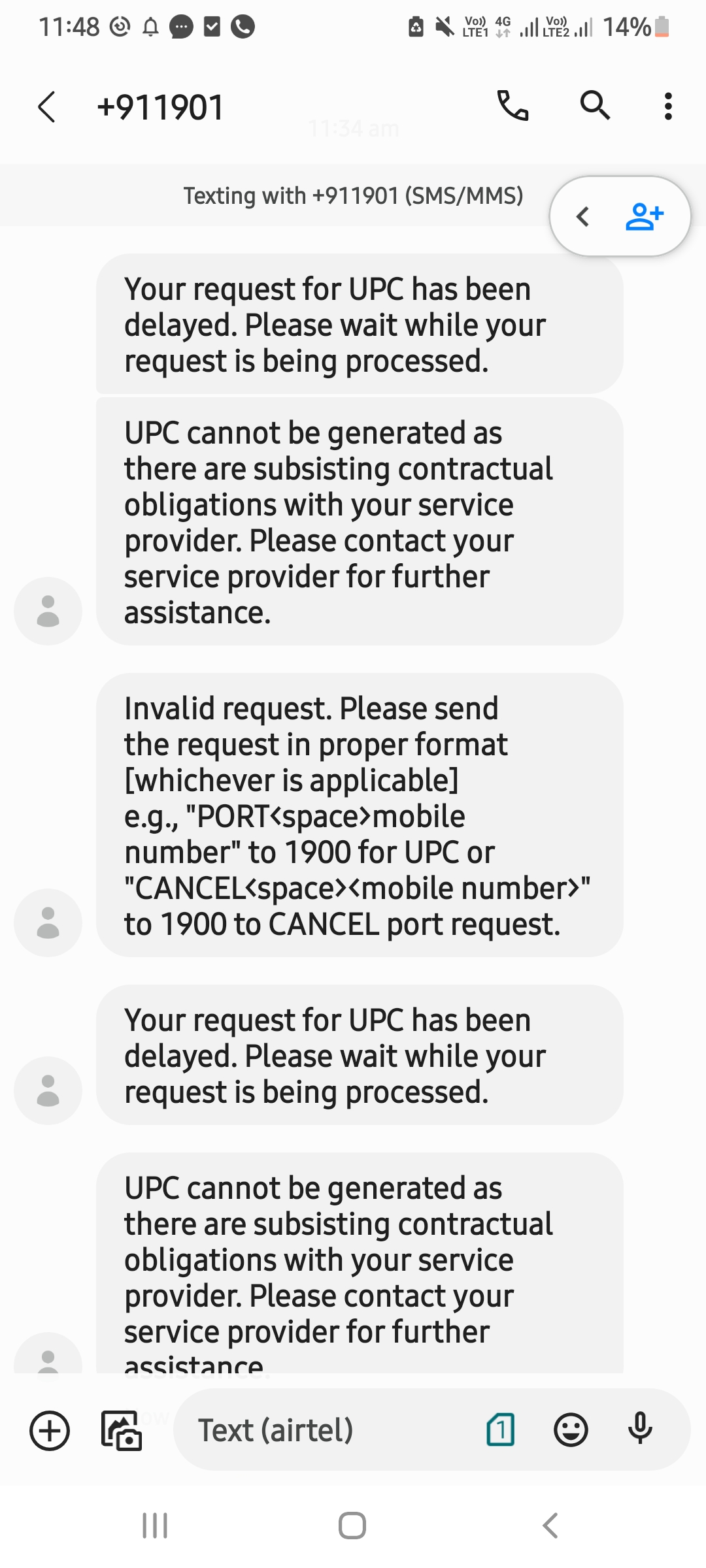 I anju verma want to port my airtel no. I sms to 1900 many times to generate upc but it showing UPC cannot be generated as there are subsisting contractual obligations with your service provider. Please contact your service provider for further assistance all the times.plz solve the issue.
