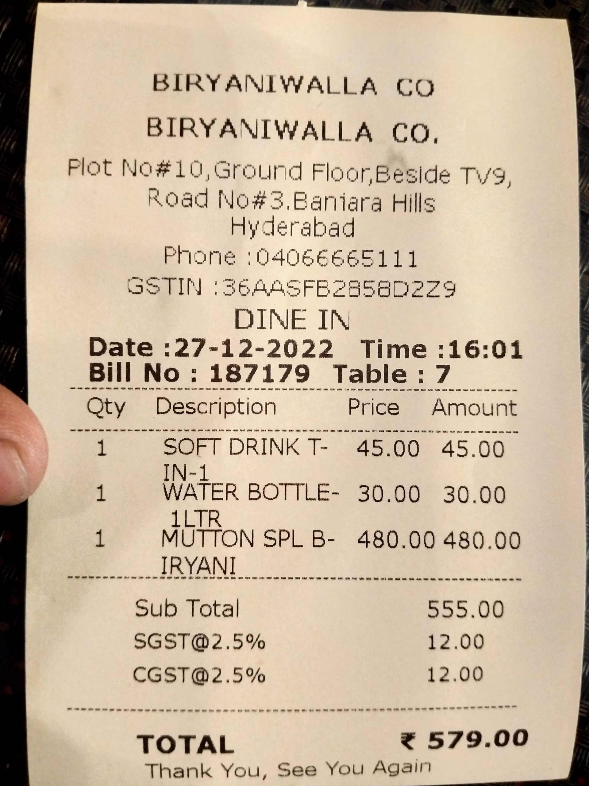 Hi i have been charge 10rs extra for a water bottle rs30 instead of 20 rupees. At biryaniwalla co at banjarahills. Iam attaching bill copy
