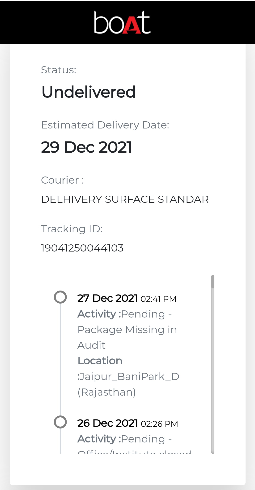I ordered boat smartwatch from boat website and paid fully. Delivery agent contacted me on 26dec, I wasn’t able to pick call but now they are not updating when they will deliver the product and also site track is showing product is missing, I don’t know what to do please help me in getting the product.