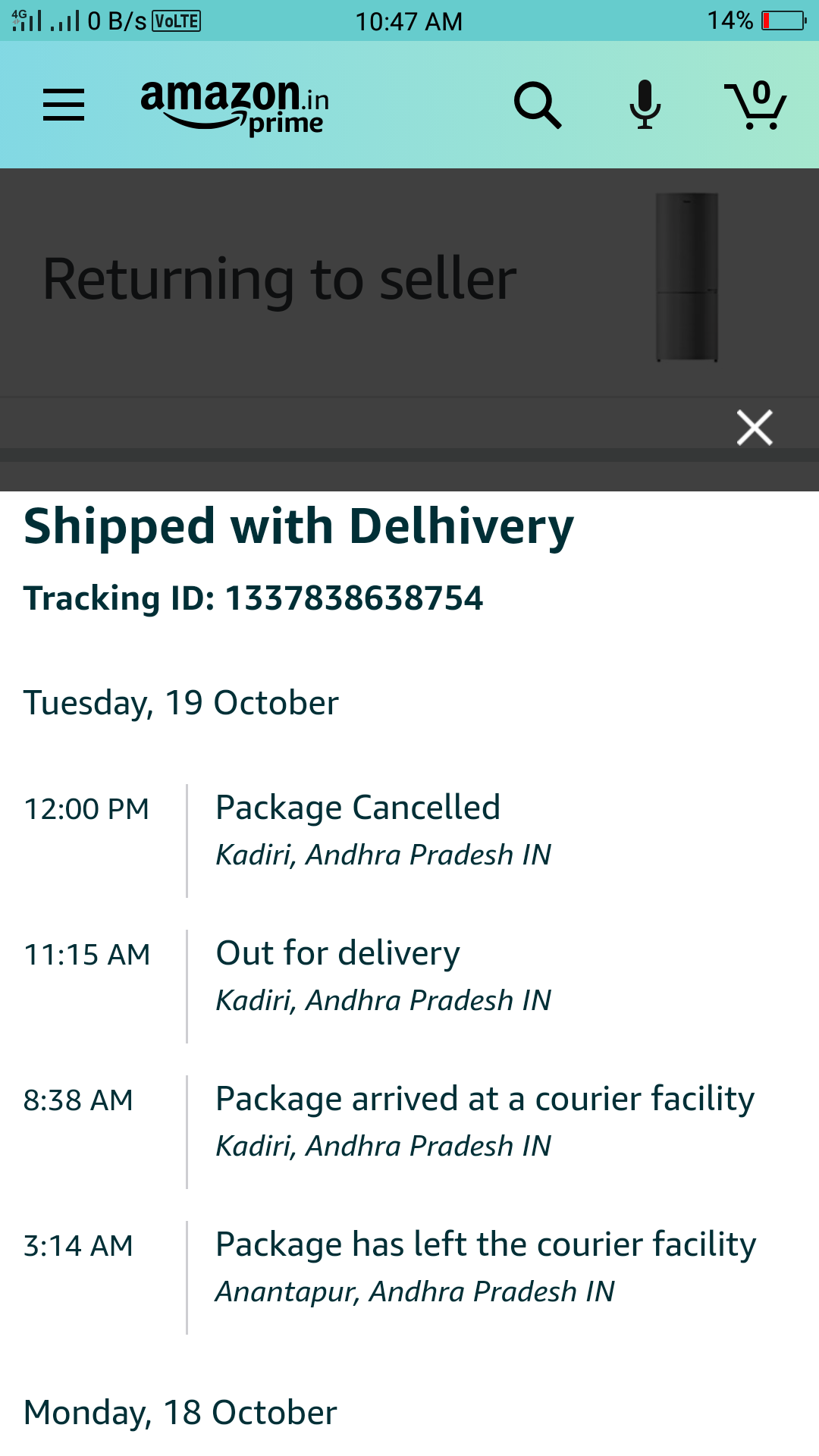 I have ordered Haier 256 L 3 Star Inverter Frost-Free Double Door Refrigerator (HRB-2764CIS-E) on 10th of oct (Order no:#404-7465540-0670700) and parcel was arrived on 14th oct to nearest hometown but delivery agent called us and said we will not deliver to doorstep if required come and collect from hub,then immediately i called customer care they said it will be delivered to doorstep by end of the day, meanwhile the delivery agent cancelled my order ,so again i spoke to customer care they appolize for the incident and asked me to book again and they will take special note and deliver the product ASAP.