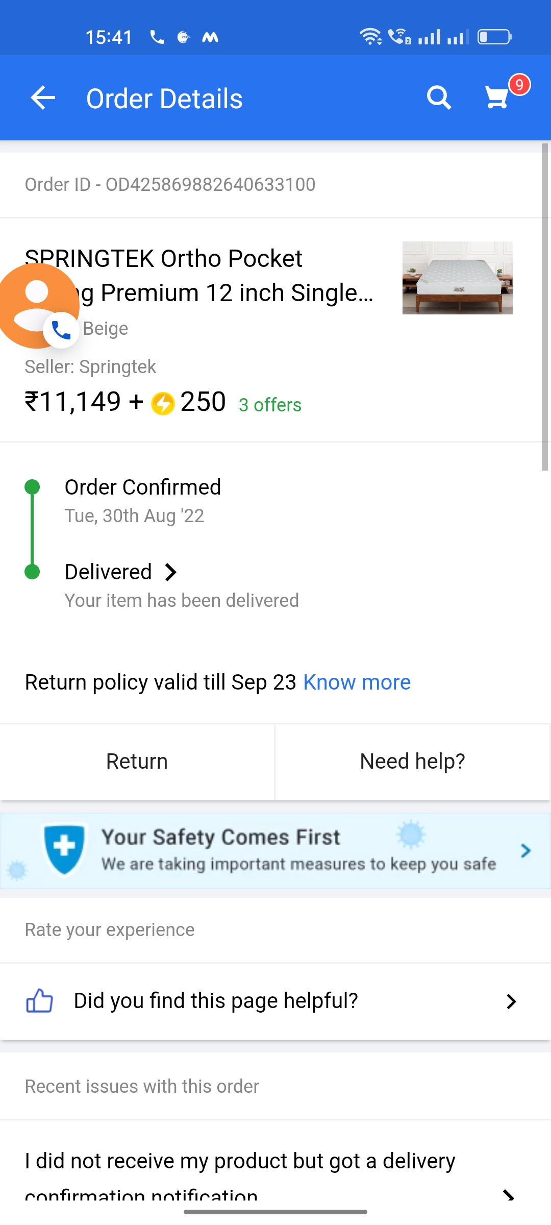 I am ordered a mattress (springtek-12 inch) on 30 th August 2022 and paid rupees 11,149/- for the same. On 13 th September, it shows that the product is delivered to me. No one deliver my product and is cheating. I raised complaint against Flipkart customer for that in last four days.But no one resolve issues.