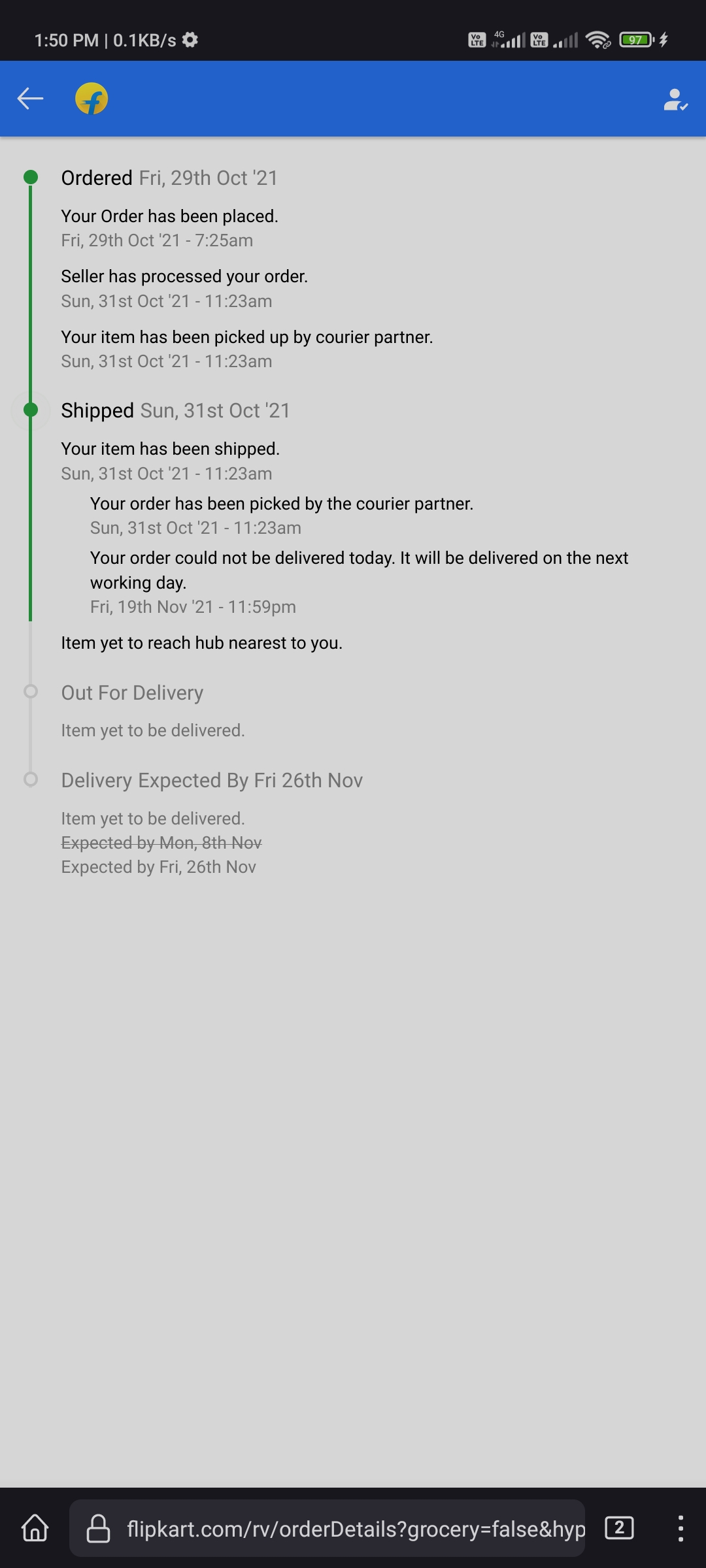 I placed an order for springtex matress with Order ID – OD223232775109174000 on 29th Oct 21 and prepaid amount for same but till date(19 Nov 2021 ) product not delivered and not getting response from company. In the website there is no courier details or tracking details available .3 times they have postponed the delivery date but still customer care can’t help getting who is courier or when it will be delivered .. need help on this .