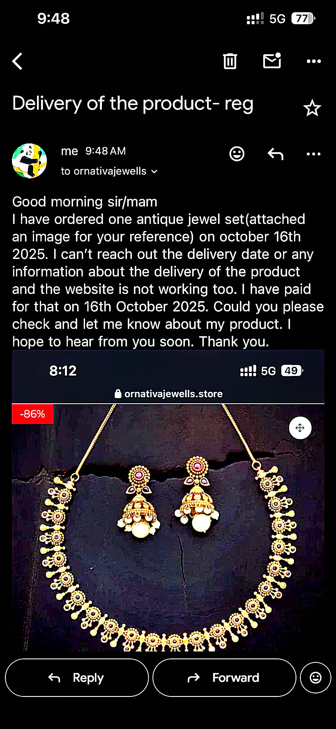 I have ordered a jewel set in the ornativa jewellery website on 16th OCT and received the order confirmed mail about the order