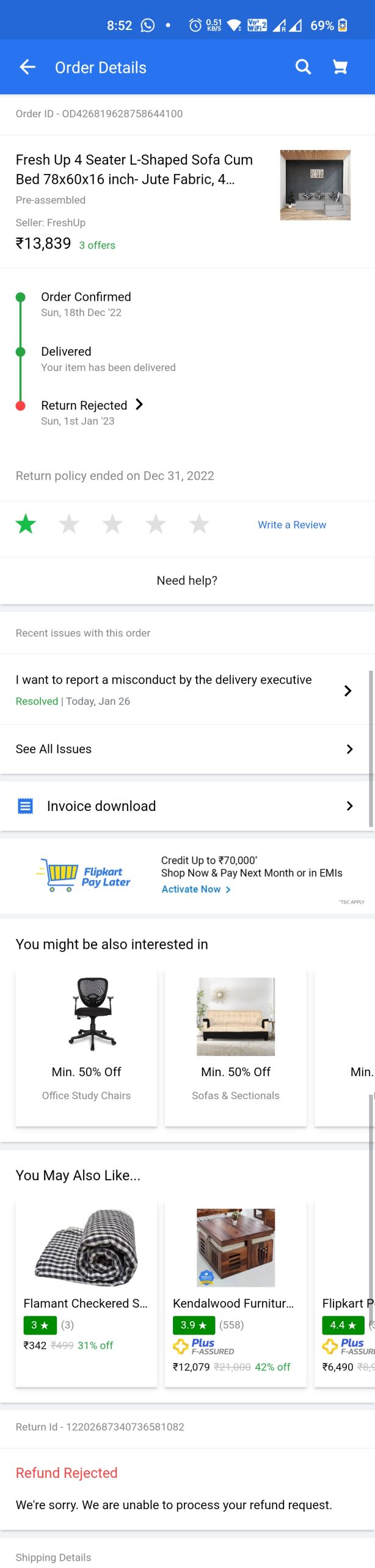 I had ordered fresh-up 5 seater sofa from Flipkart. It was delivered on 21 December, 2022. Due to its folds being uncomfortable while using as a lounge, I had placed return request. The sofa was picked up by Flipkart delivery partner named Krishna (98916 01980) on 25th December, 2022. As the order status was not changed by evening, I raised help request on their platform the same day that the status is not shown as ‘picked’, Flipkart customer care assured that it will be done in 2 days if the item is already picked up. I waited for 1 week but no status changed. Meanwhile I received 2 calls from different persons next week from Flipkart that a technician visit is scheduled to check the return item. I explained both of them that it is already picked up, on it they said that it sometimes happens that item gets picked up by delivery so they cancelled the technician visit themselves. After 10 days the status was changed to ‘refund rejected’ without any explanation. I raised complaint on customer care through Flipkart app that how can refund be rejected if the sofa is already picked up. They acknowledged the mistake and created a ticket with id IN22122518404033382613. I got no resolution on that ticket and again the status was changed to refund rejected after 6 days. I again raised complaint from app and Flipkart created another ticket IN23010310124396017326. Every time I followed up, they gave me a standard response that they’re checking the issue from courier team or delivery team and made me wait for 2-3 days every time. It has been 1 month now and yesterday they asked me for pickup receipt. As we all know Flipkart doesn’t provide any receipt on product return pickup. When I tried to confront them that Flipkart is trying to avoid resolving this issue by asking me pickup receipt, the customer executive cut the call and again the status of the issue is marked as ‘refund rejected’. One thing here to note is that Flipkart has changed the status of another item ‘grey carpet’ that I had raised return request as ‘refund processed’. This rug is still with me and Flipkart is trying to give me refund of Rs 600 to hide their goofup of my sofa that cost me Rs 14000. I have call recordings of the same to verify the issue. Please help me resolve this issue as it is a high value item and I am facing a lot of technical and mental trouble from Flipkart.