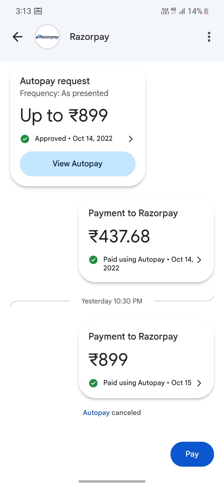 An amount of Rs. 899/- was transferred to Razorpay (razorpay.2@icici) on consecutive days. This was done without any consent from our end. We do not know the party to which the amount has been transfered as well. The autopay has been enabled till July 2023. I have disabled this for now. Please take actions accordingly and let us know the details by which we can retrieve our amount.