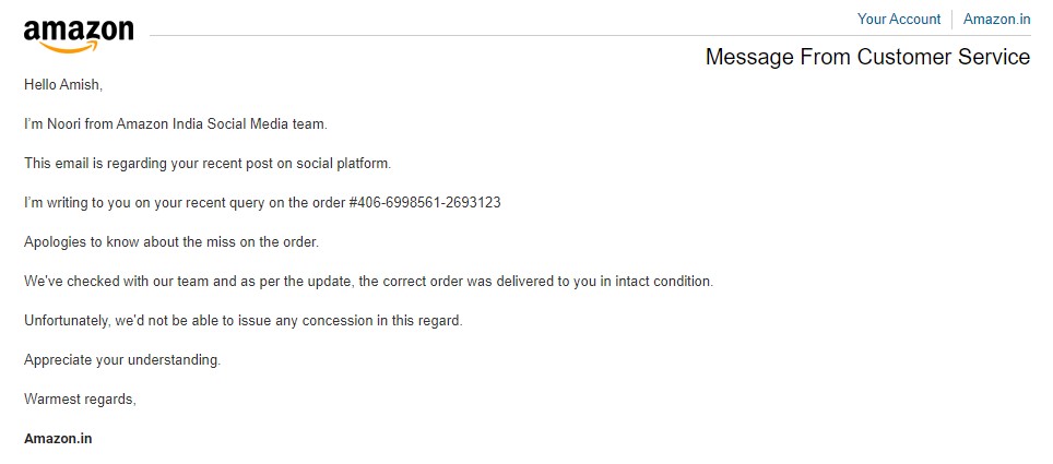 On 13th March I ordered a laptop RAM worth 5550/-. I received the package in a brown letter cover type packaging with plastic wrap filled in it. I contacted back amazon regarding this, they said allow us 5 days of time to investigate. I received 2 calls regarding the inquiry and then no response. I called back amazon they said it was delivered intact, and can’t help you out. I am also not denying that the package was not intact but the item was missing. I got over social media they stopped responding there also and then I again called back on 20th march and they said give us 5 days. They didn’t asked for any photograph to investigate, they just investigated without any proof and came to a resolution for not providing any further support. Also in an ongoing call they disconnect the call intentionally, because there is no callback received from their side.