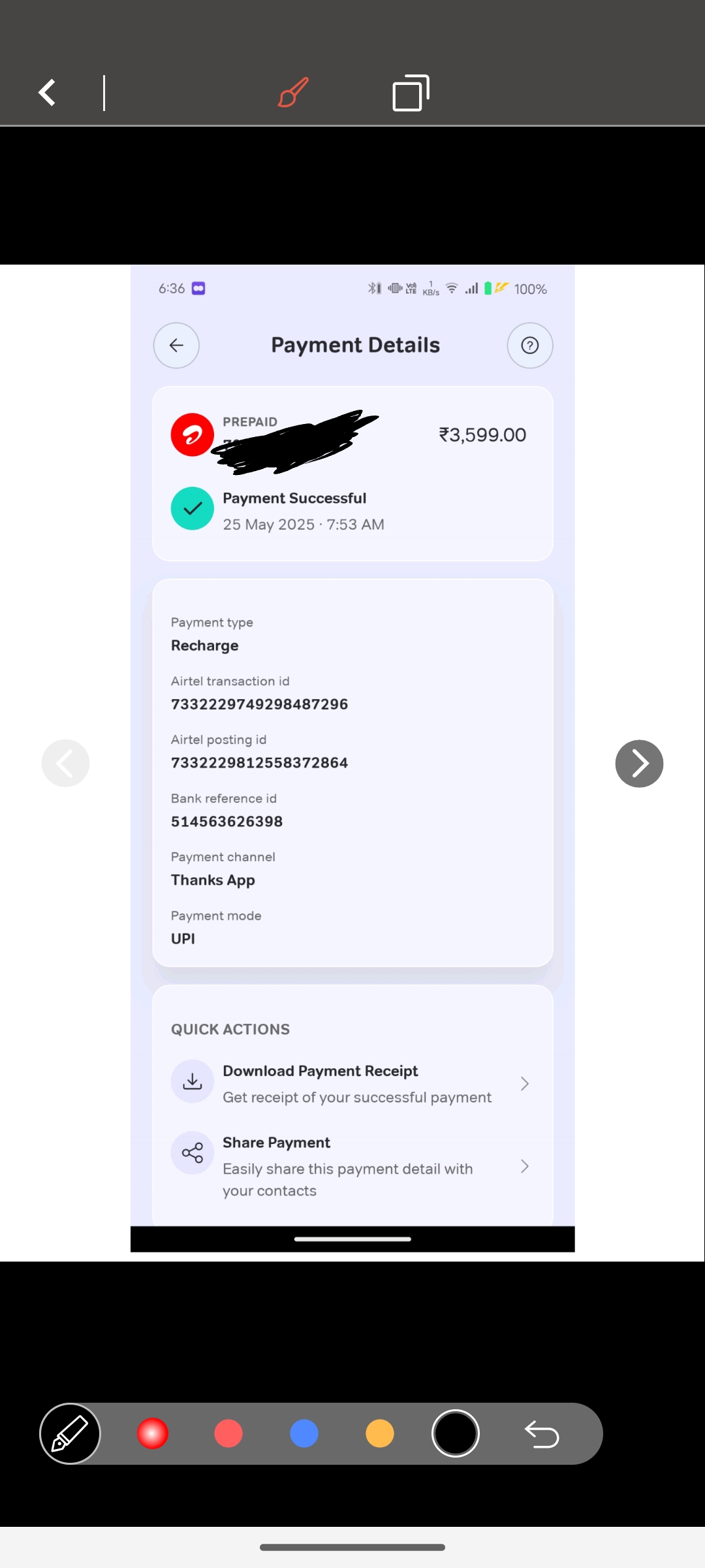 Galti se Airtel Thanks app mein prepaid to postpaid conversion ho gaya (OTP auto-fill ho gaya). by glitch postpaid per click ho gaya aur usmein OTP auto fil Ho Gaya khud Se change ho gaya postpaid mein jab mere ko message aaya 04/12/2025 evening mein to maine subah call kiya 05/12/2025 morning me Maine Airtel 198 customer care se baat ki aur wapas prepaid mein convert karwaya, aur mere ko bola Gaya customer care ke dwara ki aapka pahle wala hi Bhai sab ho aa jayega recharge bhi a jaega but 06/12/2025 morning me again prepaid ho gya confirmation message aaya lekin mera previous 1 saal ka recharge (amount: 3599] , transaction ID:- 7332229749298487296,]) ka bacha hua recharge ,balance/refund nahi mila.