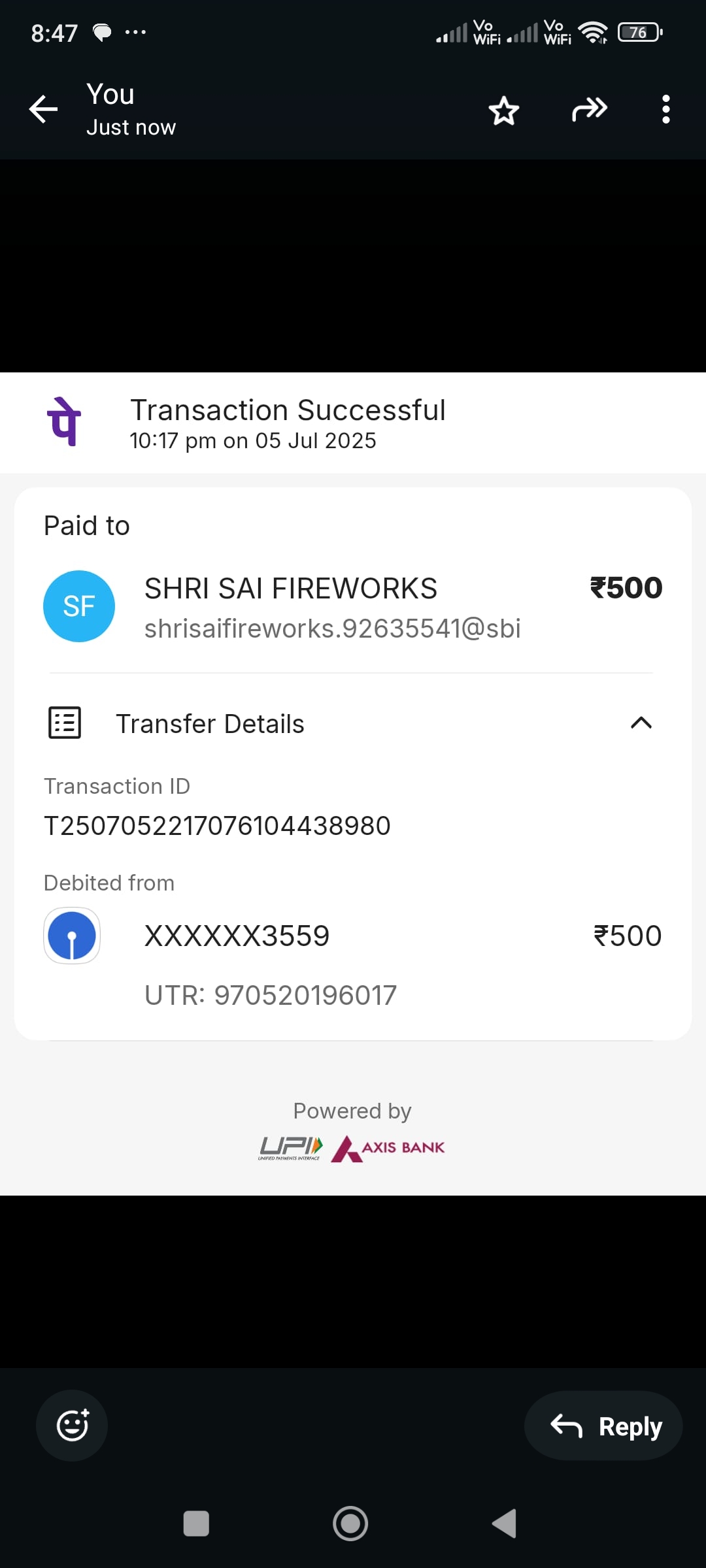 I had recharge my account on 5 July at 10:17 pm into account of shri sai firework@92635541 vide utr no. 970520196017 but till now won’t get my recharge in my account. Kindly do the need full