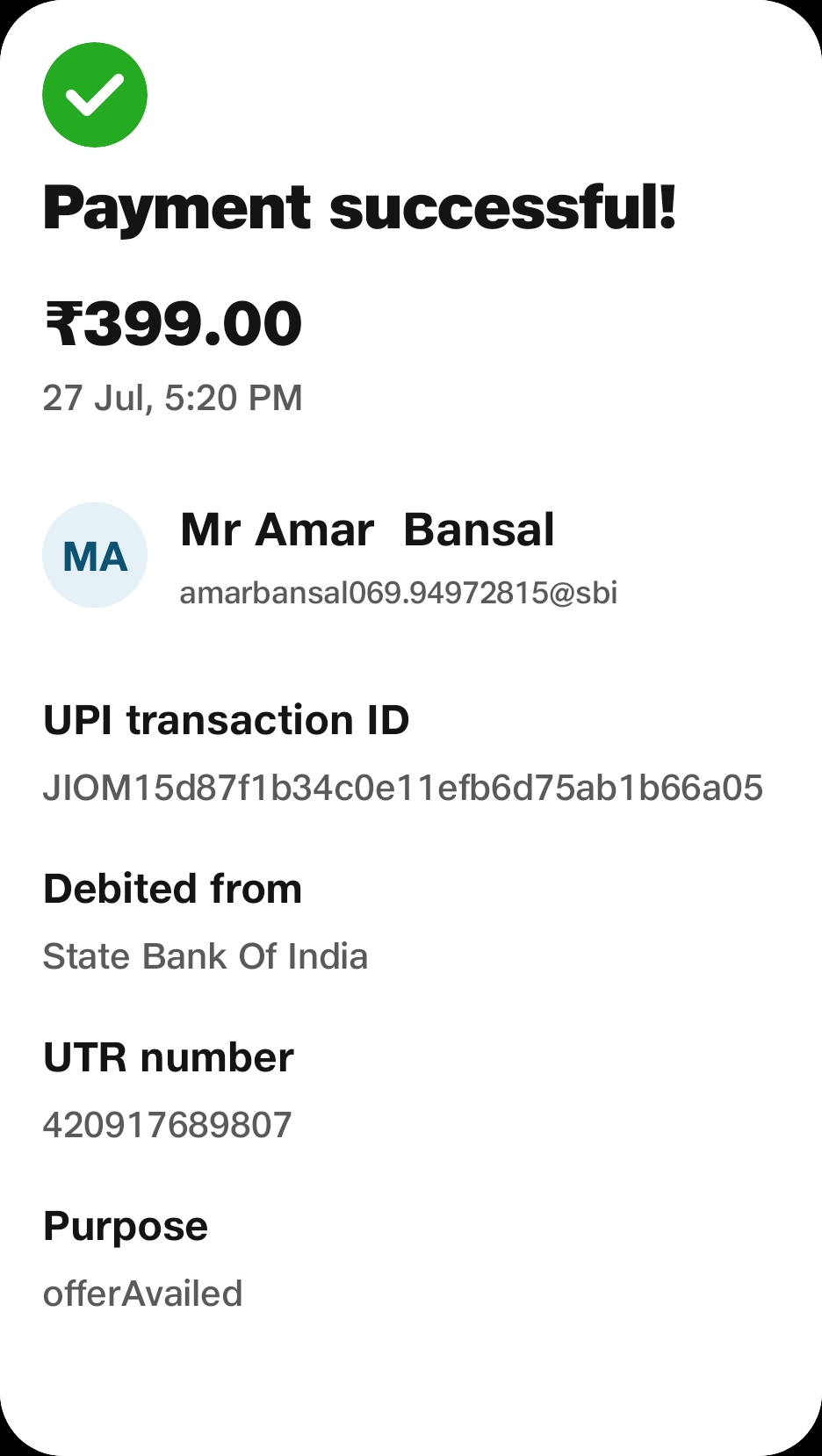 I have done a transaction of 399₹ jio recharge which was offer in Facebook of 2999₹ so please refund my money back soon as possible.