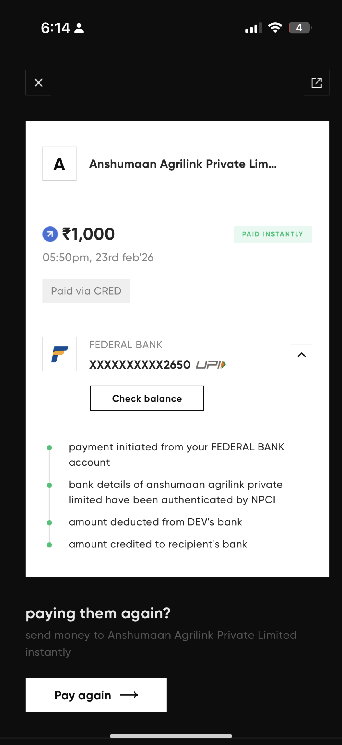 I made a recharge of rs 1000 but amount is not credited in my game id 2147631