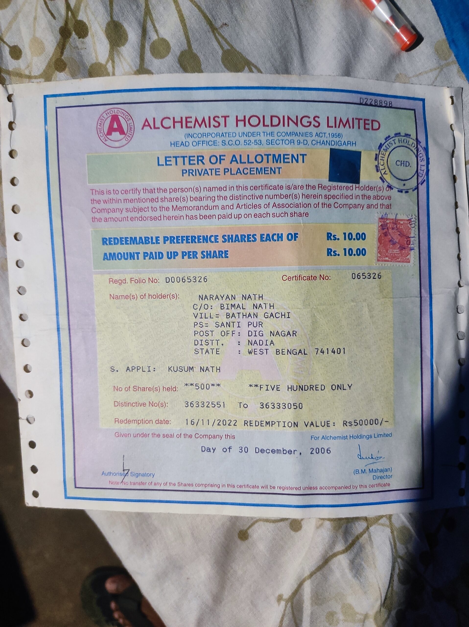 I, Narayan Nath, bought some shares in Alchemist Holdings Limited back in 2006, I was a shareholder of this company. I got a certificate of proof. The certificate says the shares I’ve bought it’ll be worth 50000INR in 2022 and it will be worth redemption. Now as a common man I don’t know what they are doing with all that judiciary things. I just need that redeemable money.