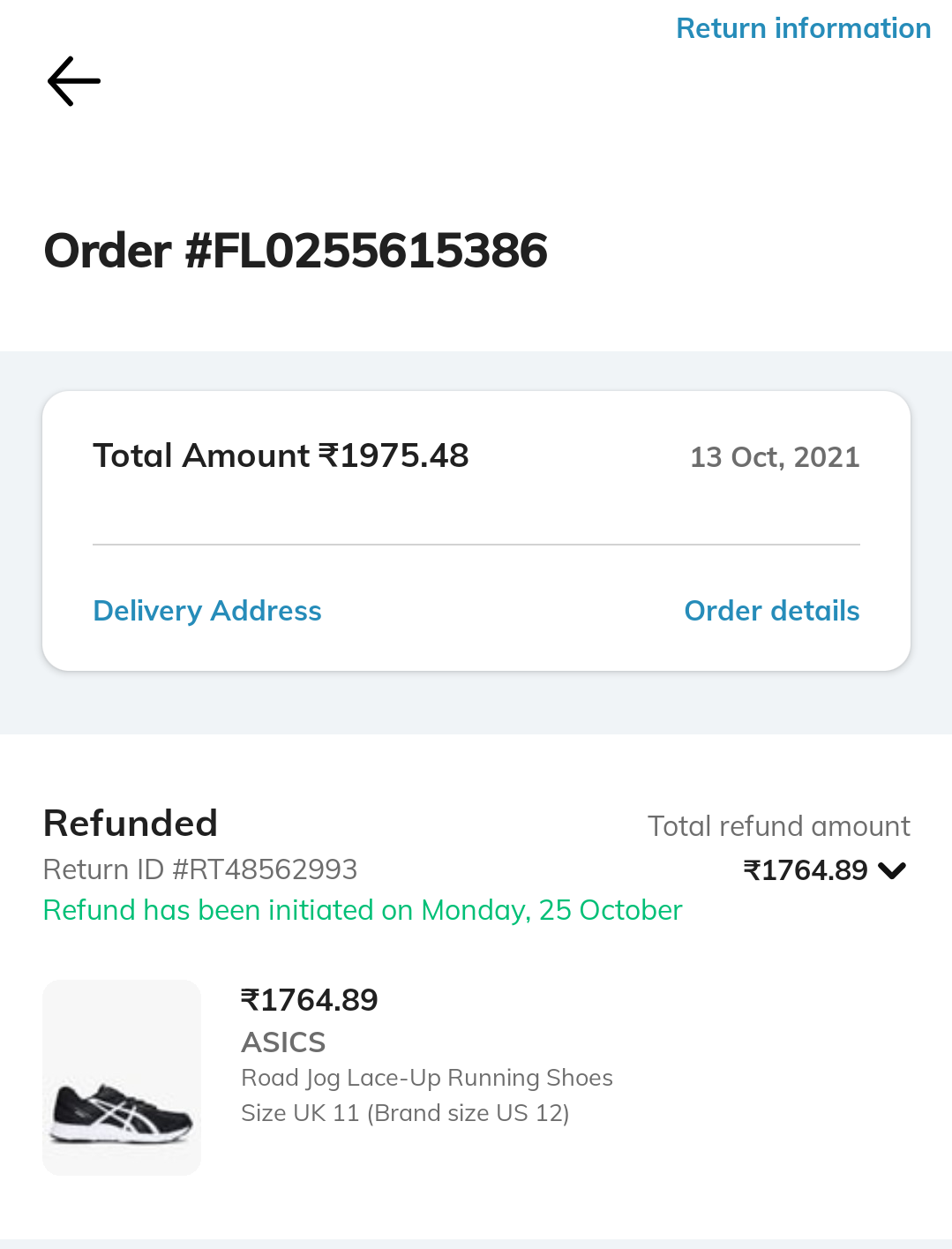 I have returned shoes of 18th oct, and return initiated on 25oct but i have not recived money in my bank account. Return id is #RT48562993