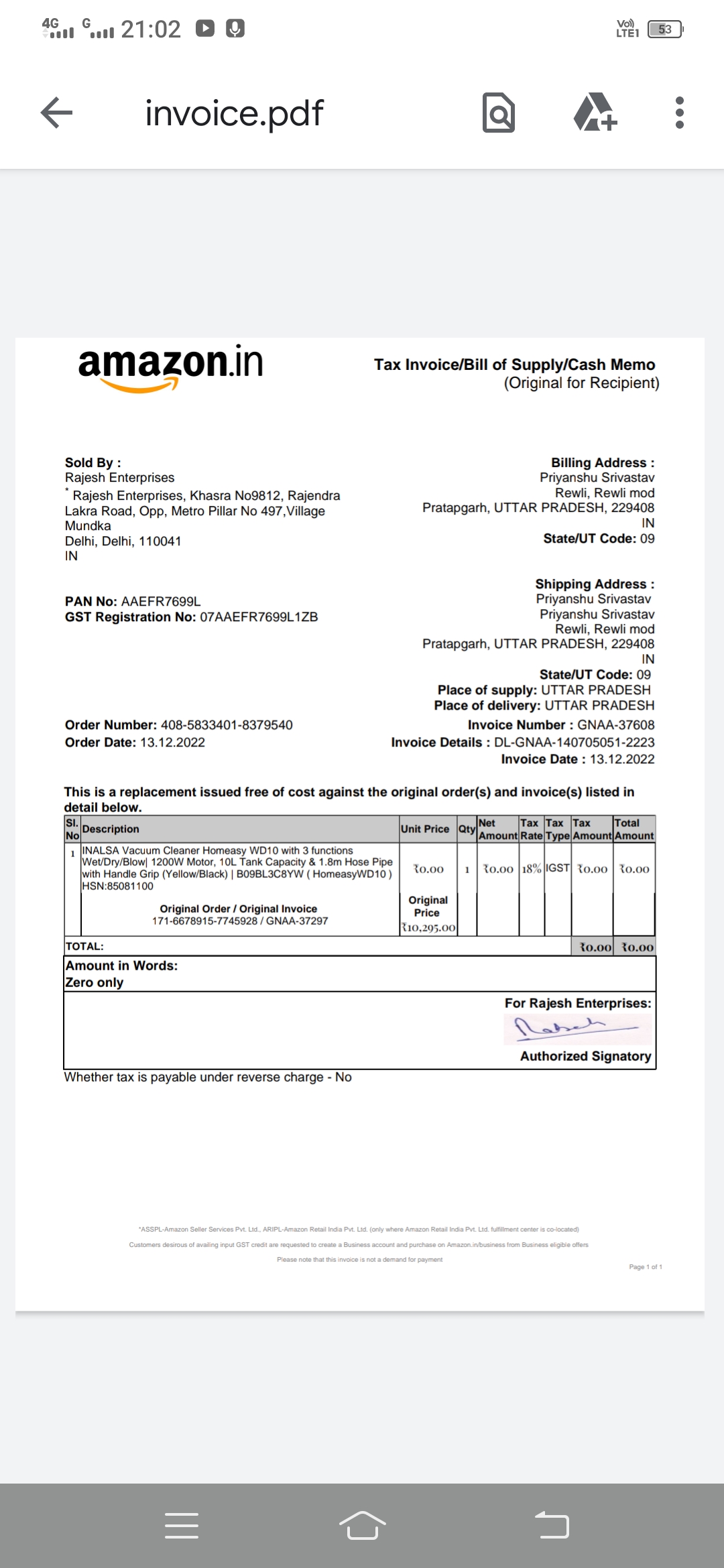 Ek inlsa vaccum cleaner mangaye the refund abhi tak hamare khate me nhi aayya