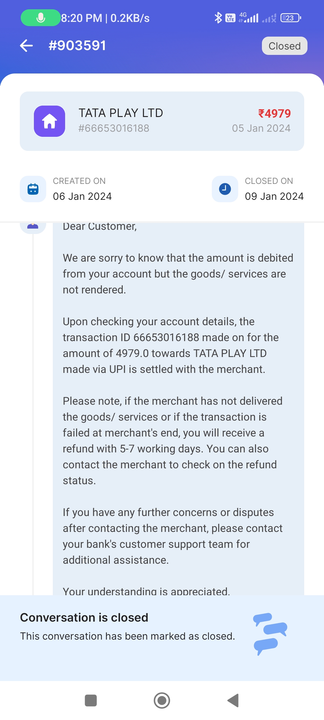 One of my payment got failed for tata play recharge. Have called multiple times to customer support team but not get refund yet.