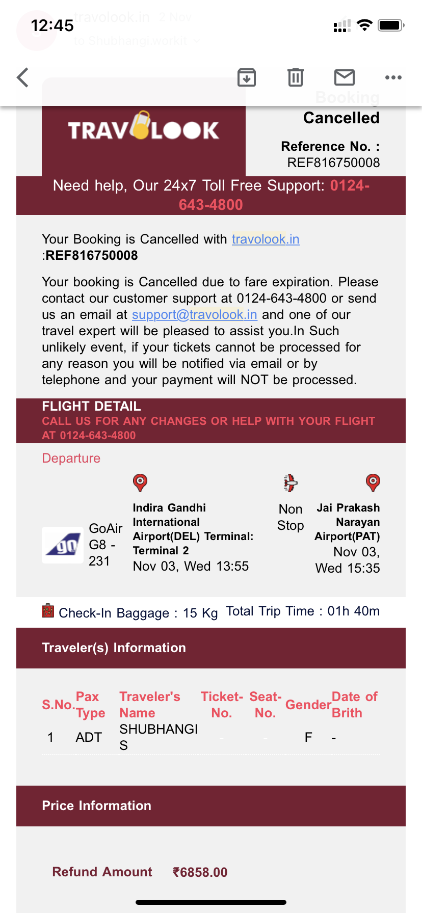 I had booked a flight ticket via Travolook on 2nd November, they canceled my ticket saying that the fare has expired. I received an email saying I would receive my refund amount ₹6858 in 7 working days. It has been almost a month now and they haven’t initiated my refund, they keep delaying the process.