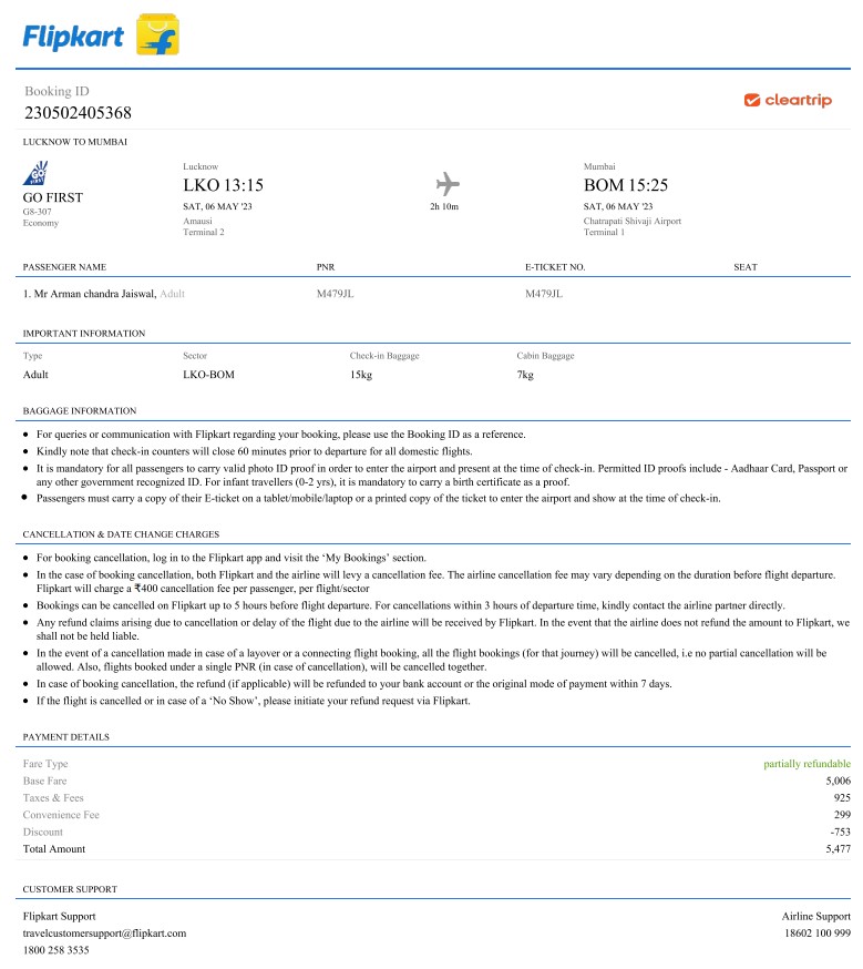 I had booked a flight from LUCKNOW to MUMBAI for date 02th MAY 2023 in airline Go-First via Flipkart platform, My flight cancelled by airline without informing me. When I checked for web check-in then I got to know about cancellation. I requested to airline for any other flight but they didn’t support and also didn’t refund my ticket money yet. Its 2 Year and 3 month passed and I am waiting for refund, no response from airline as well as from Flipkart. I am facing a lot of mental pain, because I have worked very hard for the money, I have thought of doing a journey on the flight, please get my money back