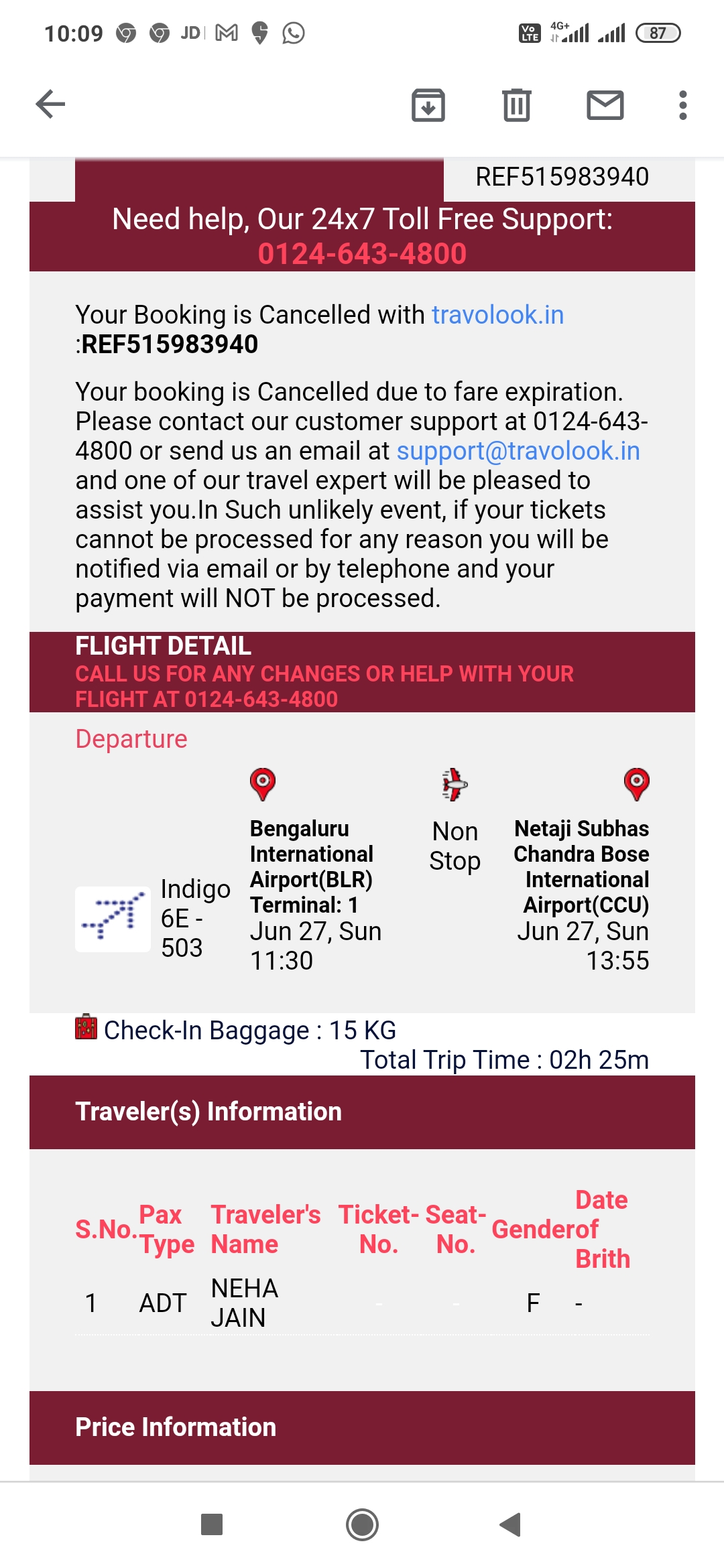 I booked my 2tkts from Banglore to Kolkata due to operations automatic cancel travolook companies said me i will refund your money in 15 to 20 working days. But it is almost more than that.