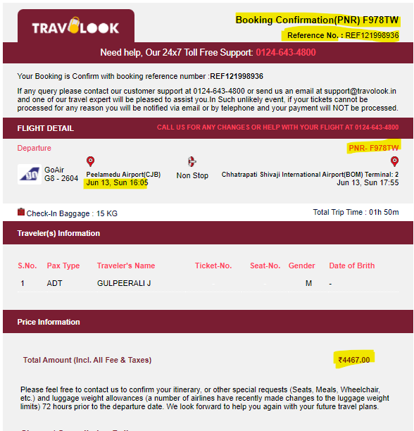 I have booked airticket (GoAir G8 2604) by Travolook Agency on 1st June 2021 from Coimbatore (CJB – Peelamedu Airport) to Mumbai(Bom – Chatrapati Shivaji International airport) & travel date was on 13th June 2021, Reference No. REF121998936 & PNR F978TW booking amount is Rs. 4467.