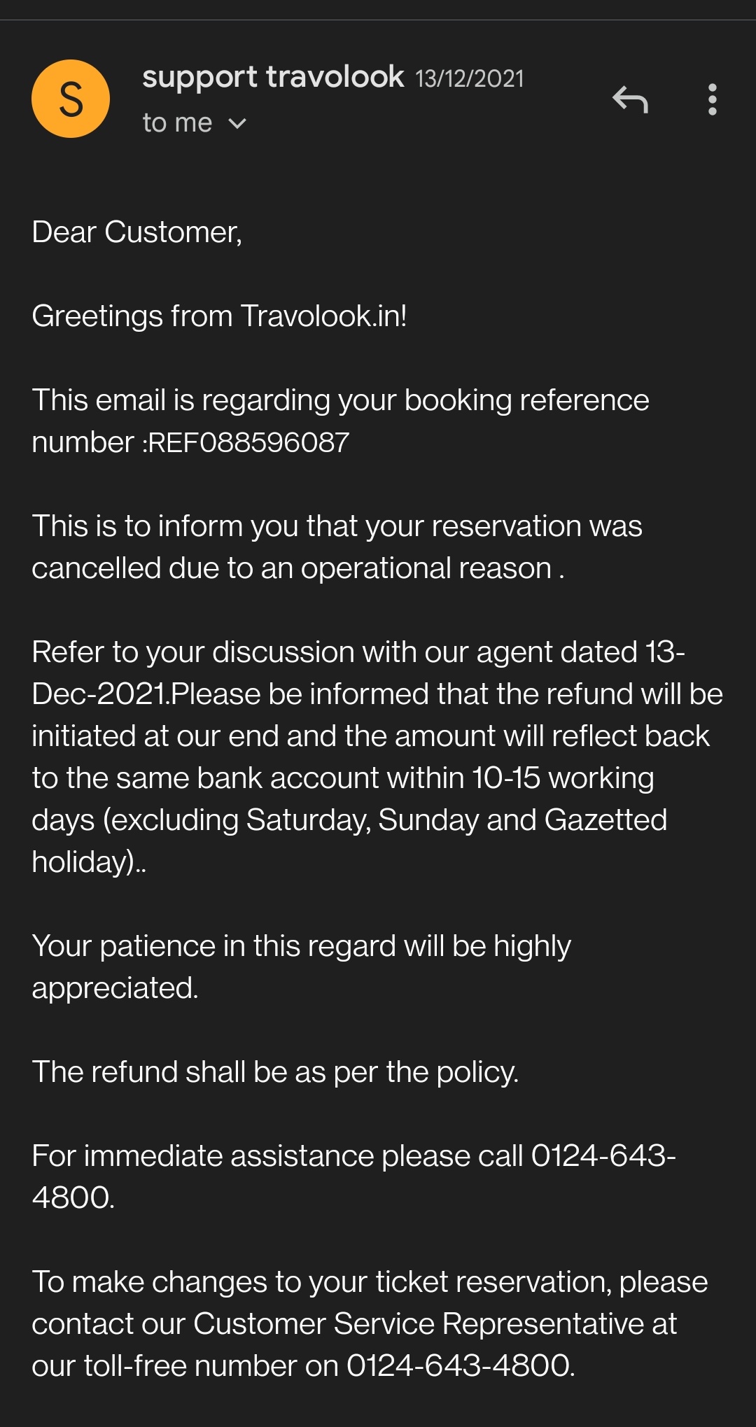 I had booked tickets on 13thDecember 2021 from delhi to Hyderabad. They cancelled my tickets because of operational reasons and told me that the refund would be given in 10 working days. Its been more than a month and i still didnt get my refund.