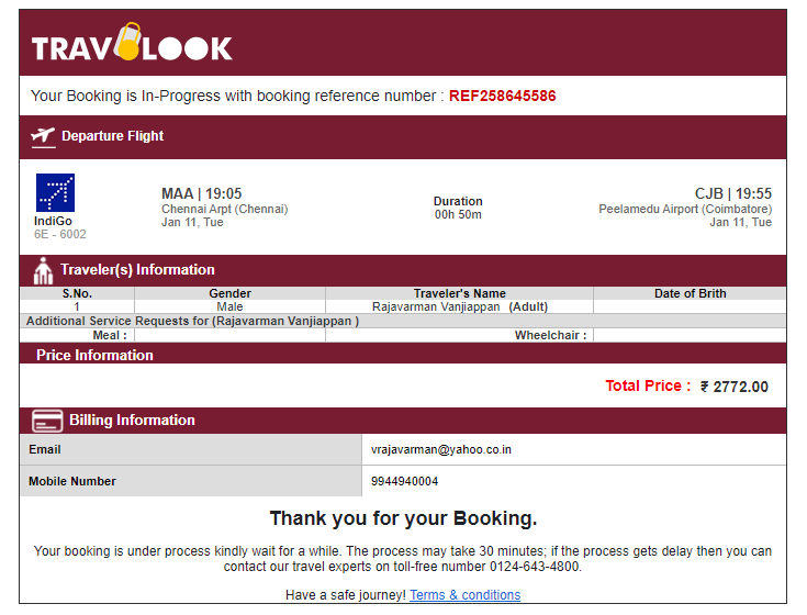 I booked a flight from Chennai to Coimbatore on jan 11 2022 and they cancelled it saying INDIGO API not working. They told refund will be given in 7-10 working days. I am calling evey day to customer support wasting 30 mins daily but they say the same thing every time. Worst ever fake company. How do i receive the refund of 2700 which Travolook owes me?